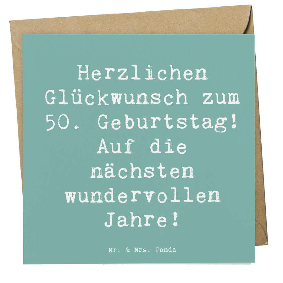 Feier den 50. Geburtstag mit Stil! Diese Deluxe Karte von Mr. & Mrs. Panda ist eine besonders hochwertige, quadratische Grußkarte, die mit dem liebevollen Spruch „Herzlichen Glückwunsch zum 50. Geburtstag! Auf die nächsten wundervollen Jahre!” bedruckt ist. Das sanfte Meeresbrise-Hintergrundmotiv sorgt für eine freundliche und moderne Optik, die perfekt zu einem besonderen Jubiläum passt. 🎉