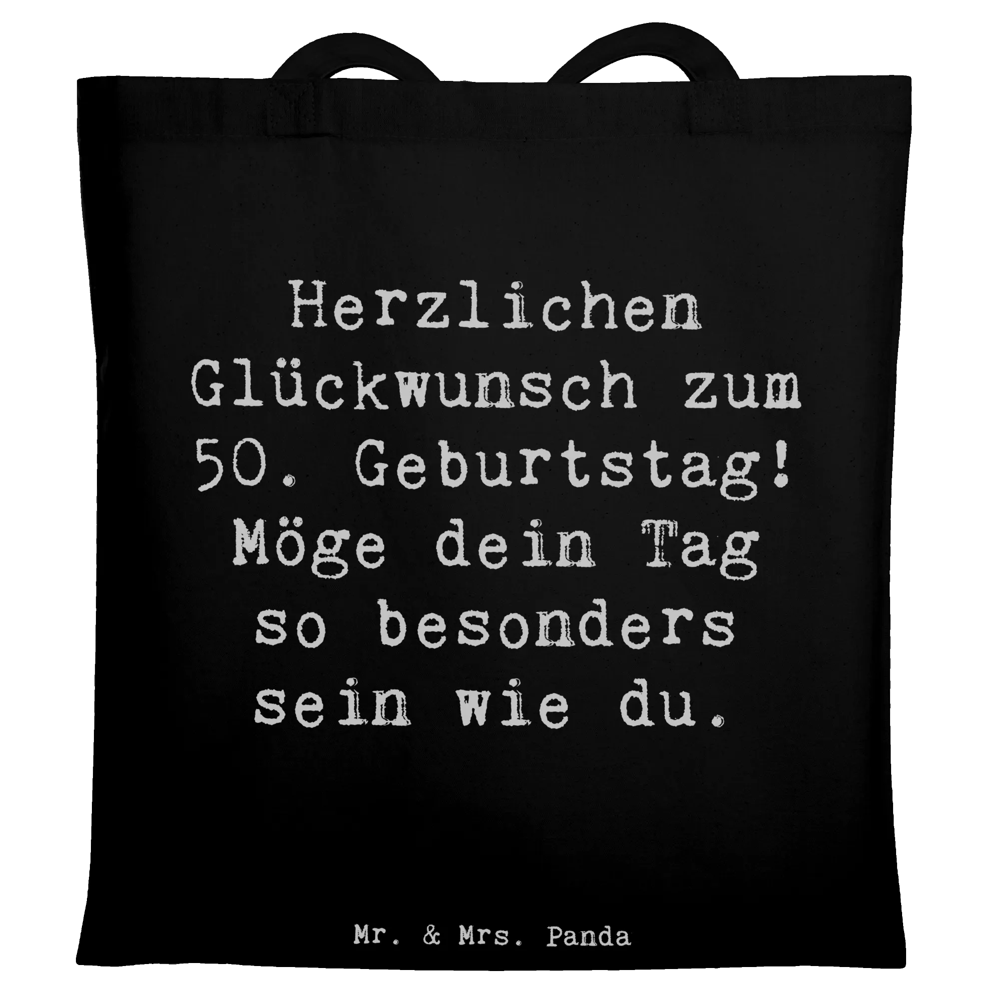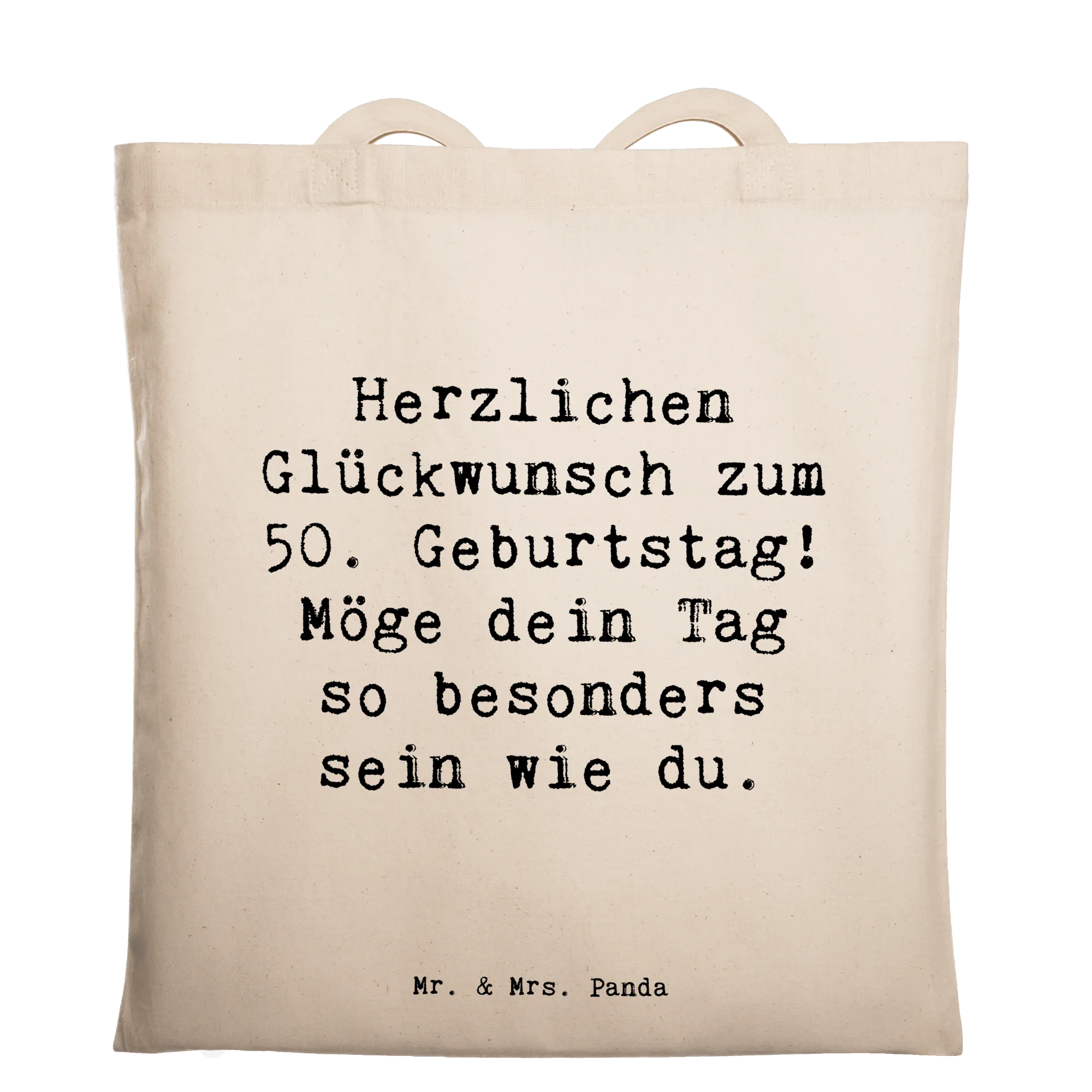 Die Tragetasche "Herzlichen Glückwunsch zum 50. Geburtstag! Möge dein Tag so besonders sein wie du." von Mr. & Mrs. Panda ist der perfekte Begleiter für jeden Anlass, besonders zum runden Geburtstag! Diese hochwertige Baumwolltasche vereint Funktionalität und stilvolles Design und sollte in keinem Haushalt fehlen. Ob als Einkaufstasche, Strandtasche oder einfach als schicke Umhängetasche – mit ihren großzügigen Abmessungen von 420 mm x 380 mm bietet sie ausreichend Platz für alles, was Du brauchst. Die Tragetasche wurde mit viel Liebe zum Detail bedruckt und kombiniert niedliche Motive mit einem liebevollen Spruch, der jeden Geburtstag auf besondere Weise würdigt.