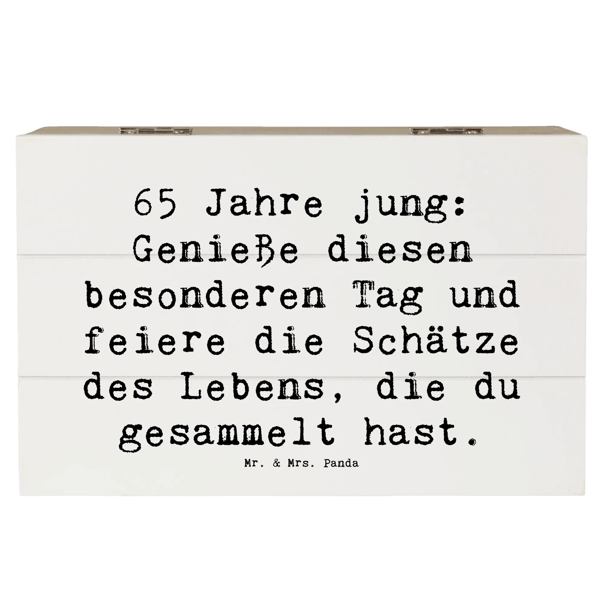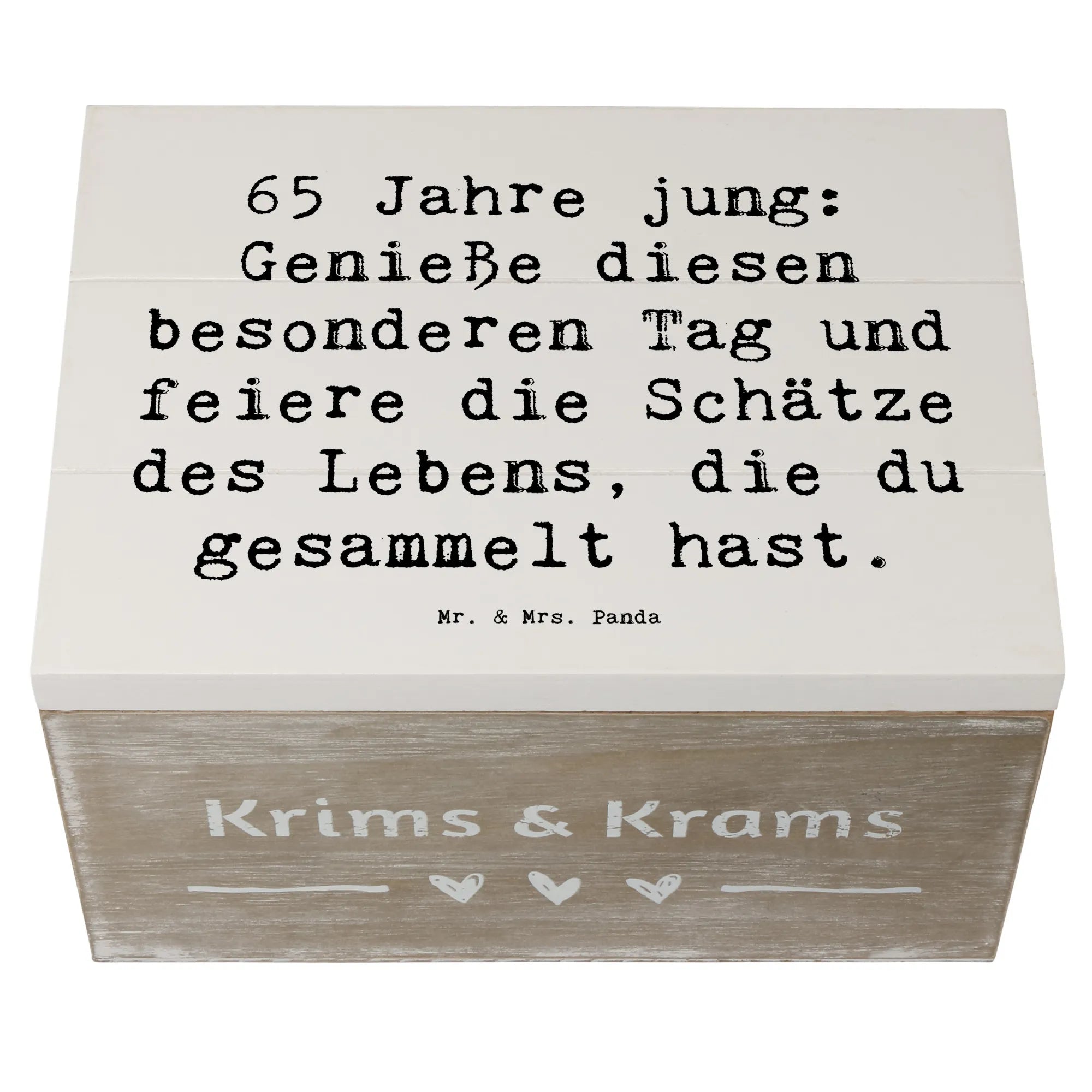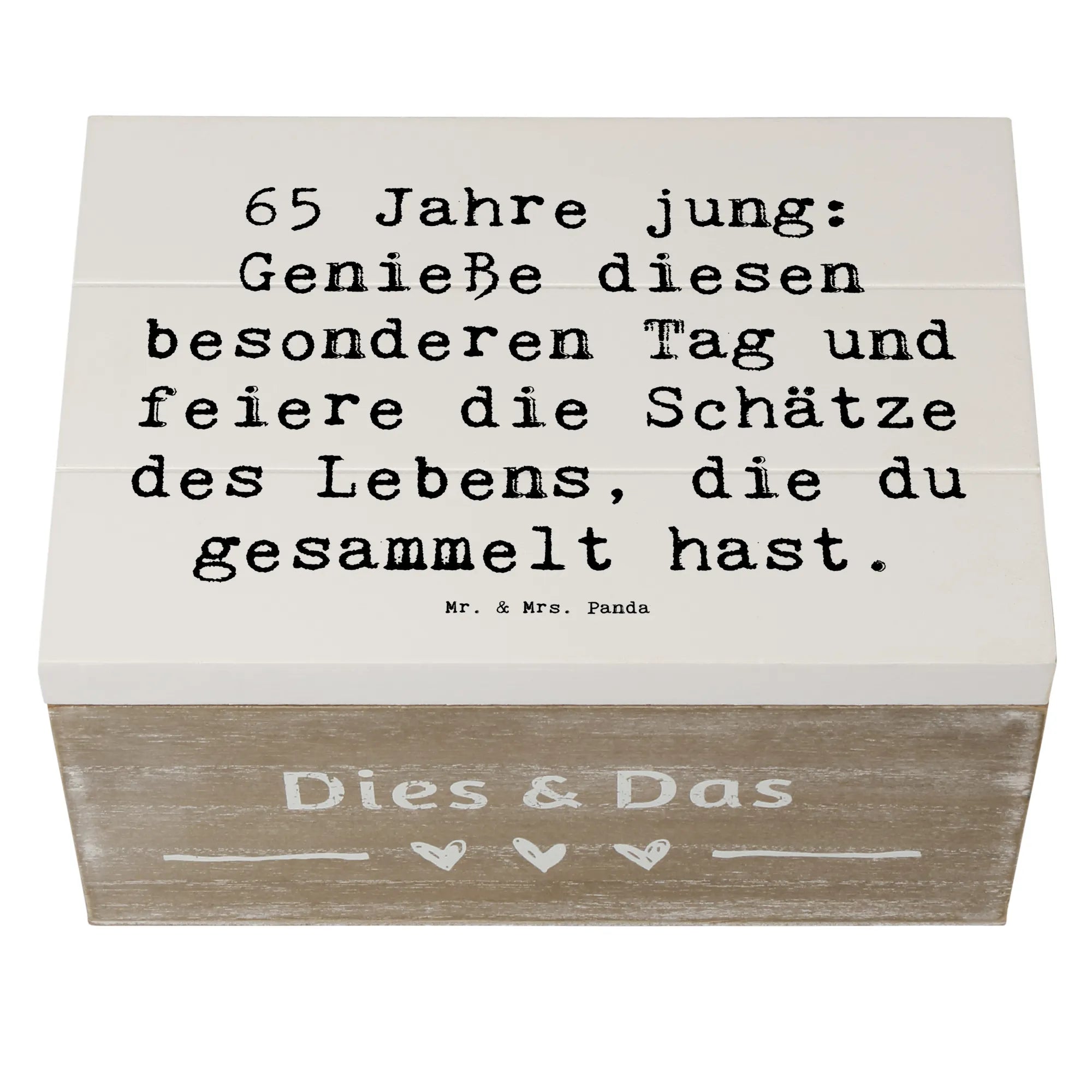 Die wunderschöne Holzkiste von Mr. & Mrs. Panda mit dem aufgedruckten Slogan "65 Jahre jung: Genieße diesen besonderen Tag und feiere die Schätze des Lebens, die du gesammelt hast." ist das ideale Geschenk für alle, die ihren 65. Geburtstag gebührend zelebrieren möchten. Diese liebevoll gestaltete Erinnerungskiste bietet nicht nur Platz für Erinnerungsstücke und Schätze, sondern ist auch ein wunderbares Deko-Element.