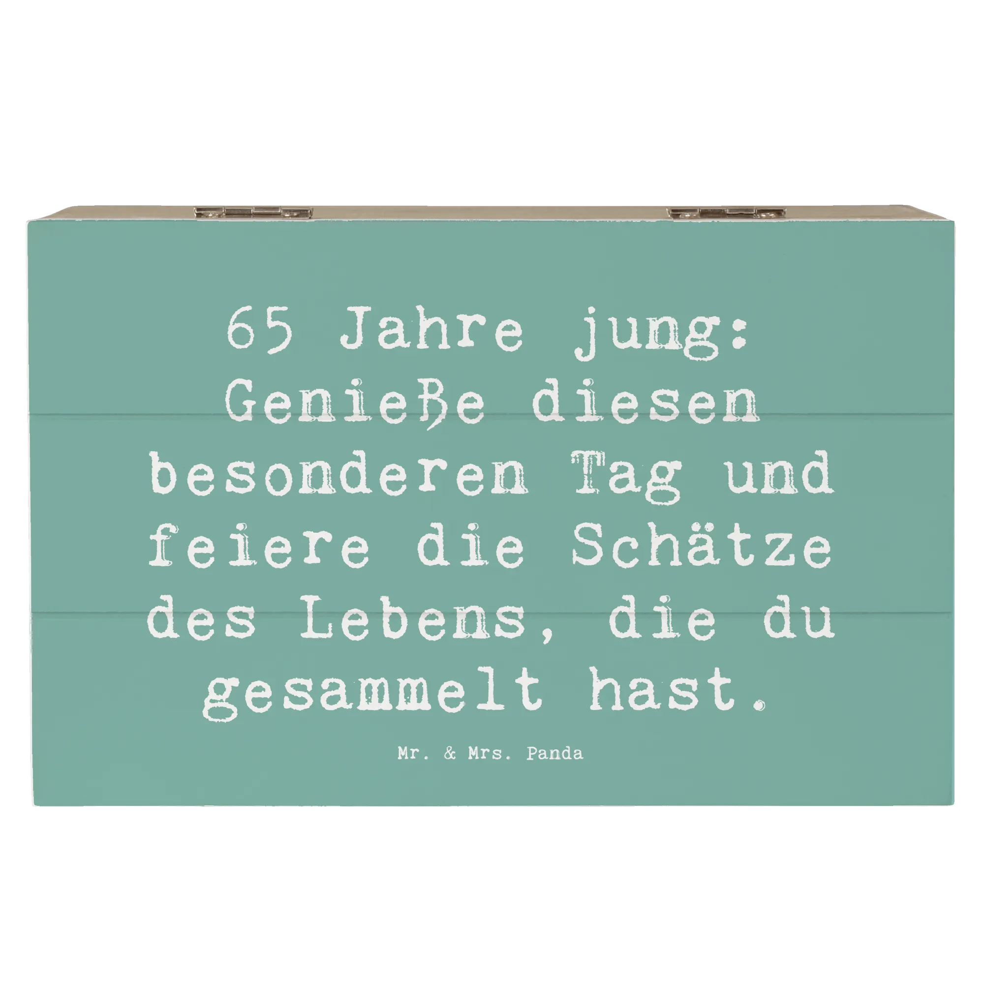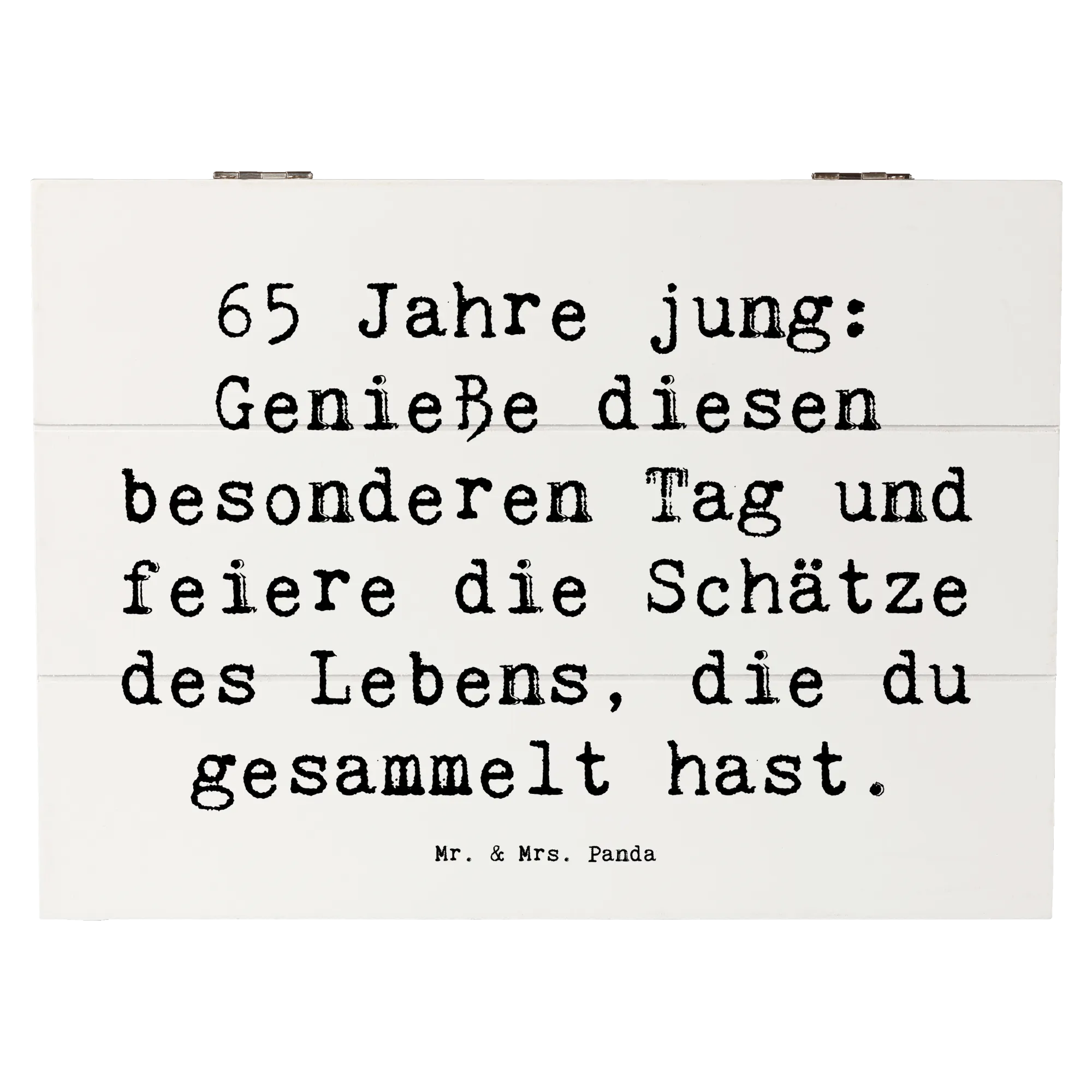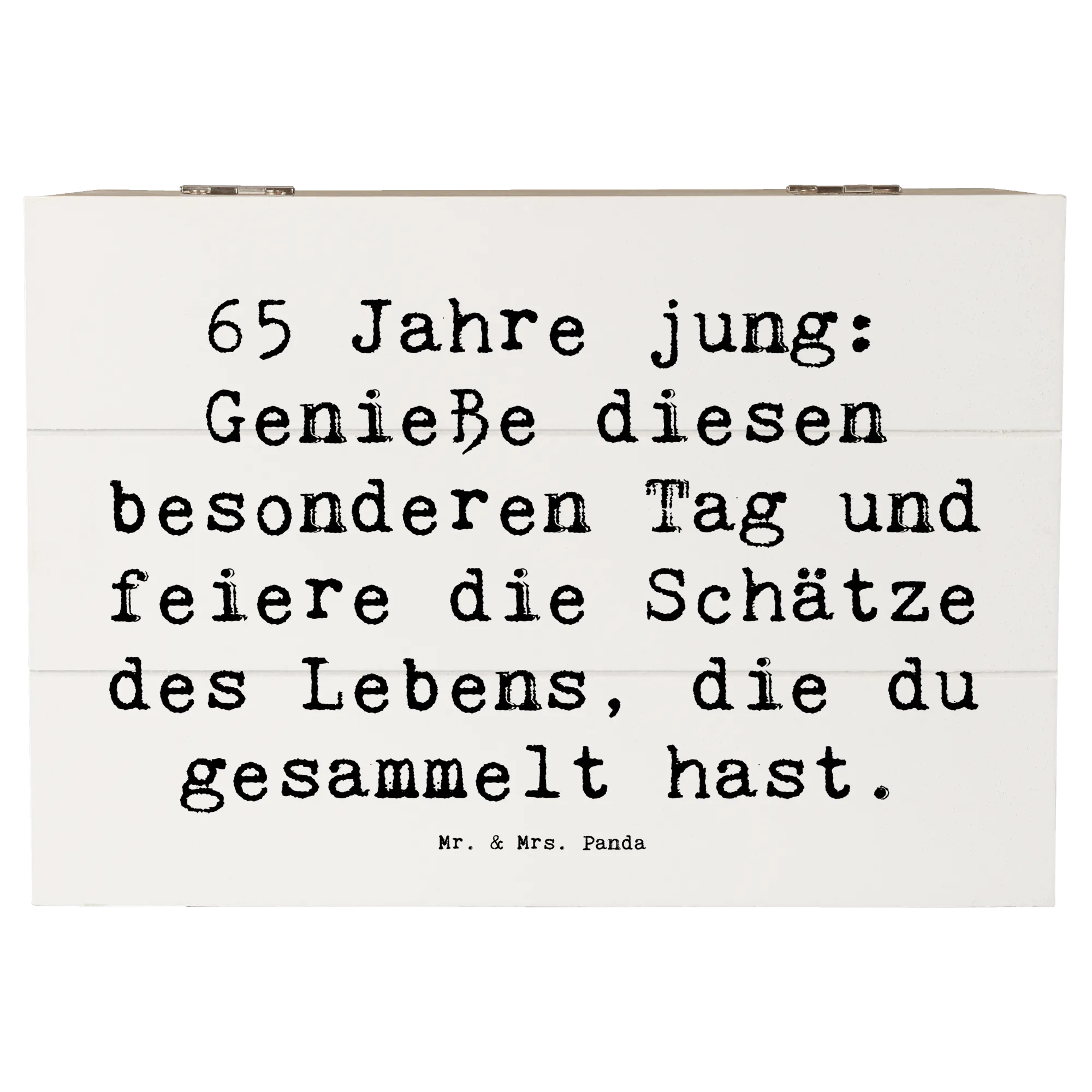Die wunderschöne Holzkiste von Mr. & Mrs. Panda mit dem aufgedruckten Slogan "65 Jahre jung: Genieße diesen besonderen Tag und feiere die Schätze des Lebens, die du gesammelt hast." ist das ideale Geschenk für alle, die ihren 65. Geburtstag gebührend zelebrieren möchten. Diese liebevoll gestaltete Erinnerungskiste bietet nicht nur Platz für Erinnerungsstücke und Schätze, sondern ist auch ein wunderbares Deko-Element.