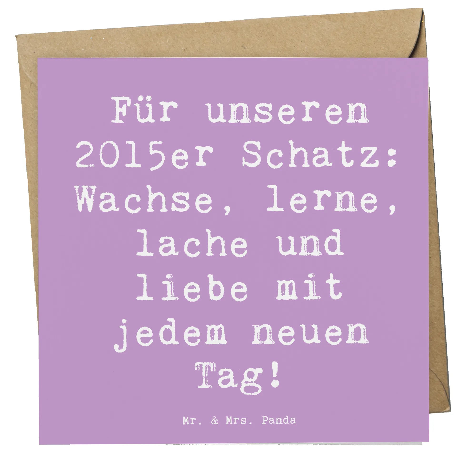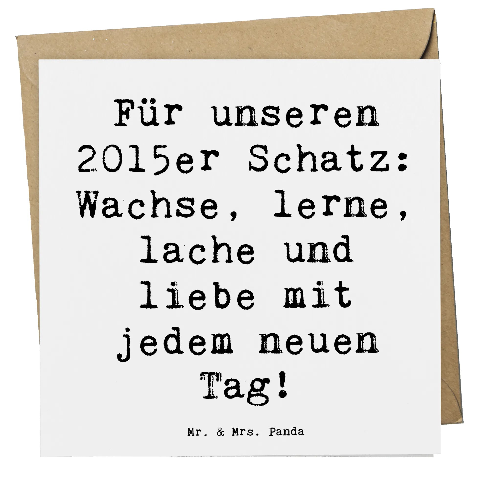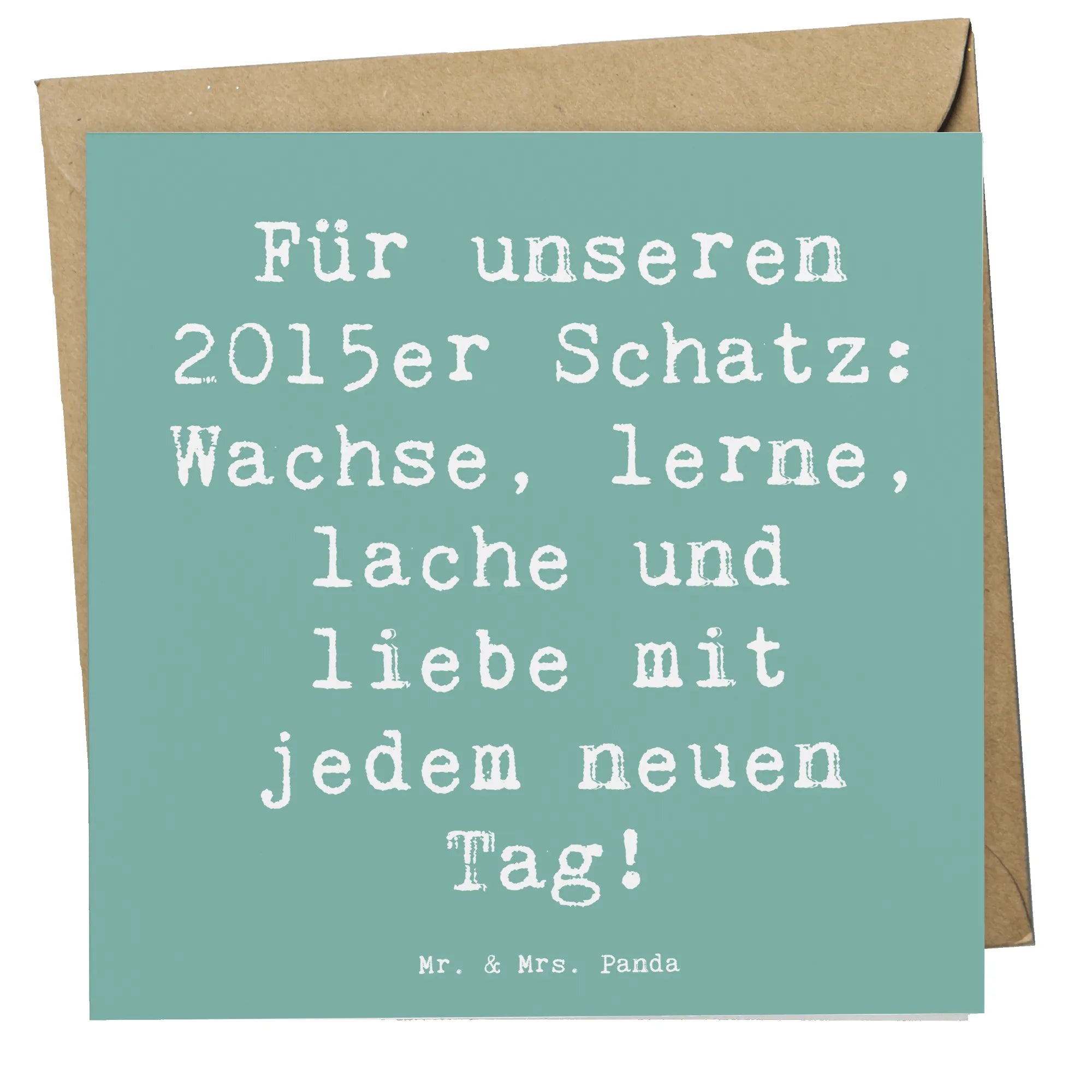Entdecke die wundervolle Deluxe Karte "2015 Geburtstag" aus der einzigartigen Kollektion "Geburtstagsgeburtsjahr" von Mr. & Mrs. Panda! Diese hochwertige Klappkarte ist nicht nur ein einfacher Gruß; sie ist eine herzliche Umarmung aus Papier, die perfekt für jeden Anlass ist, besonders für den besonderen Tag eines kleinen Schatzes, der 2015 geboren wurde. Mit einem liebevollen Spruch, der auf die Vorderseite der Karte gedruckt ist, sorgt sie dafür, dass Dein Geburtstagskind sich gleich etwas ganz Besonderes fühlt. Der Spruch lautet: "Für unseren 2015er Schatz: Wachse, lerne, lache und liebe mit jedem neuen Tag!" Damit hast Du das perfekte Geschenk, um Glückwünsche und Emotionen auszudrücken.