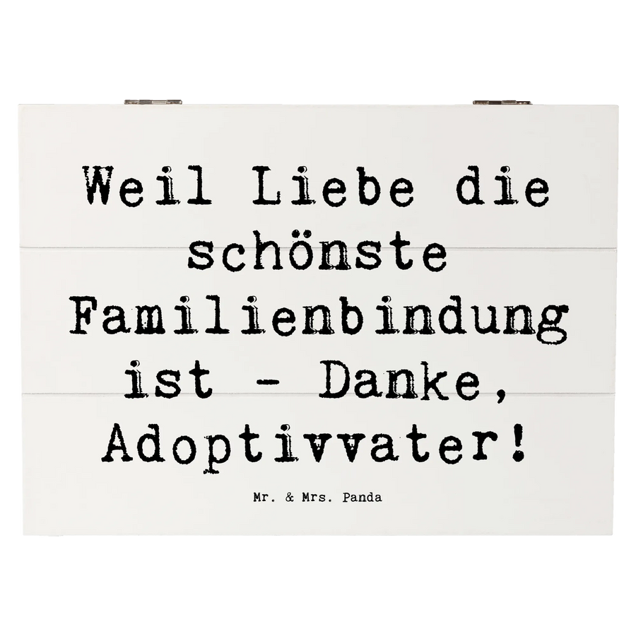 Die wunderschöne Holzkiste von Mr. & Mrs. Panda ist das perfekte Geschenk für alle, die einen Adoptivvater ehren und ihre Liebe zur Familie zelebrieren möchten. Mit dem liebevollen Slogan 'Weil Liebe die schönste Familienbindung ist - Danke, Adoptivvater!' bietet diese Kiste nicht nur Platz für wertvolle Erinnerungen, sondern auch eine herzliche Botschaft, die das Band zwischen Adoptivvater und Kind stärken kann.