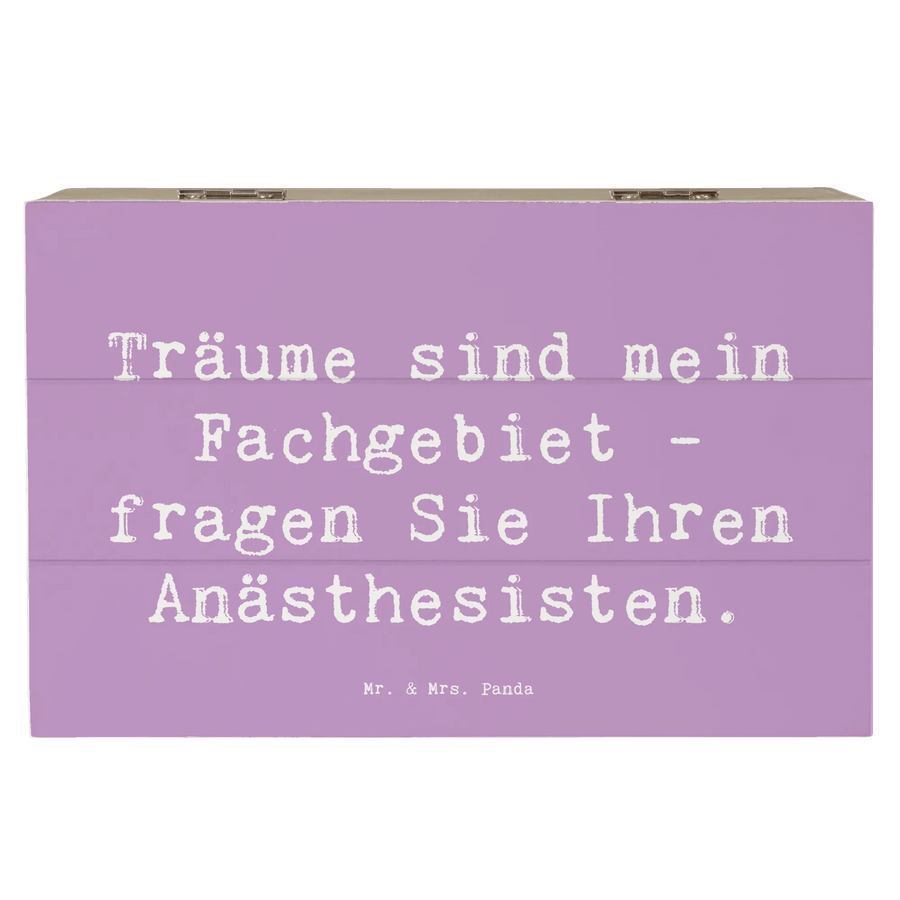 Eine wunderschöne Holzkiste von Mr. & Mrs. Panda, die ganz im Zeichen des Anästhesisten steht! Mit dem liebevoll gestalteten Spruch "Träume sind mein Fachgebiet - fragen Sie Ihren Anästhesisten" wird dieses besondere Stück zum idealen Geschenk für alle, die diesen faszinierenden Beruf ausüben.
