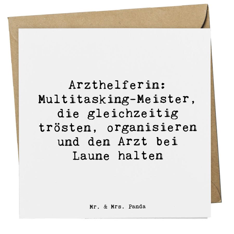 Die Deluxe Karte "Arzthelferin" von Mr. & Mrs. Panda ist das perfekte Geschenk für jeden, der in der Gesundheitsbranche arbeitet. Diese hochwertig gestaltete Klappkarte, mit einem wunderschönen Spruch, feiert die Multitasking-Meister, die jeden Tag trösten, organisieren und den Arzt bei Laune halten.