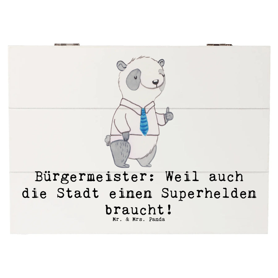 Entdecke die wunderschöne Holzkiste von Mr. & Mrs. Panda mit dem Motif "Bürgermeister: Weil auch die Stadt einen Superhelden braucht!" Diese einzigartige Kiste ist nicht nur ein perfekter Aufbewahrungsort für deine Schätze, sondern auch ein liebevolles Geschenk für jeden Bürgermeister oder Stadtverwalter.