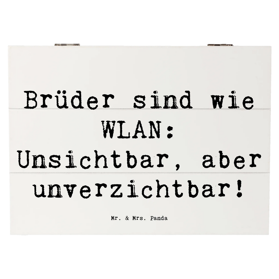 Die wunderschöne Holzkiste von Mr. & Mrs. Panda ist das perfekte Geschenk für alle Brüder, die in Deinem Leben eine besondere Rolle spielen. Mit dem spritzigen Spruch "Brüder sind wie WLAN: Unsichtbar, aber unverzichtbar!" ist diese Aufbewahrungsbox nicht nur ein funktionales Geschenk, sondern auch ein liebevolles Statement.