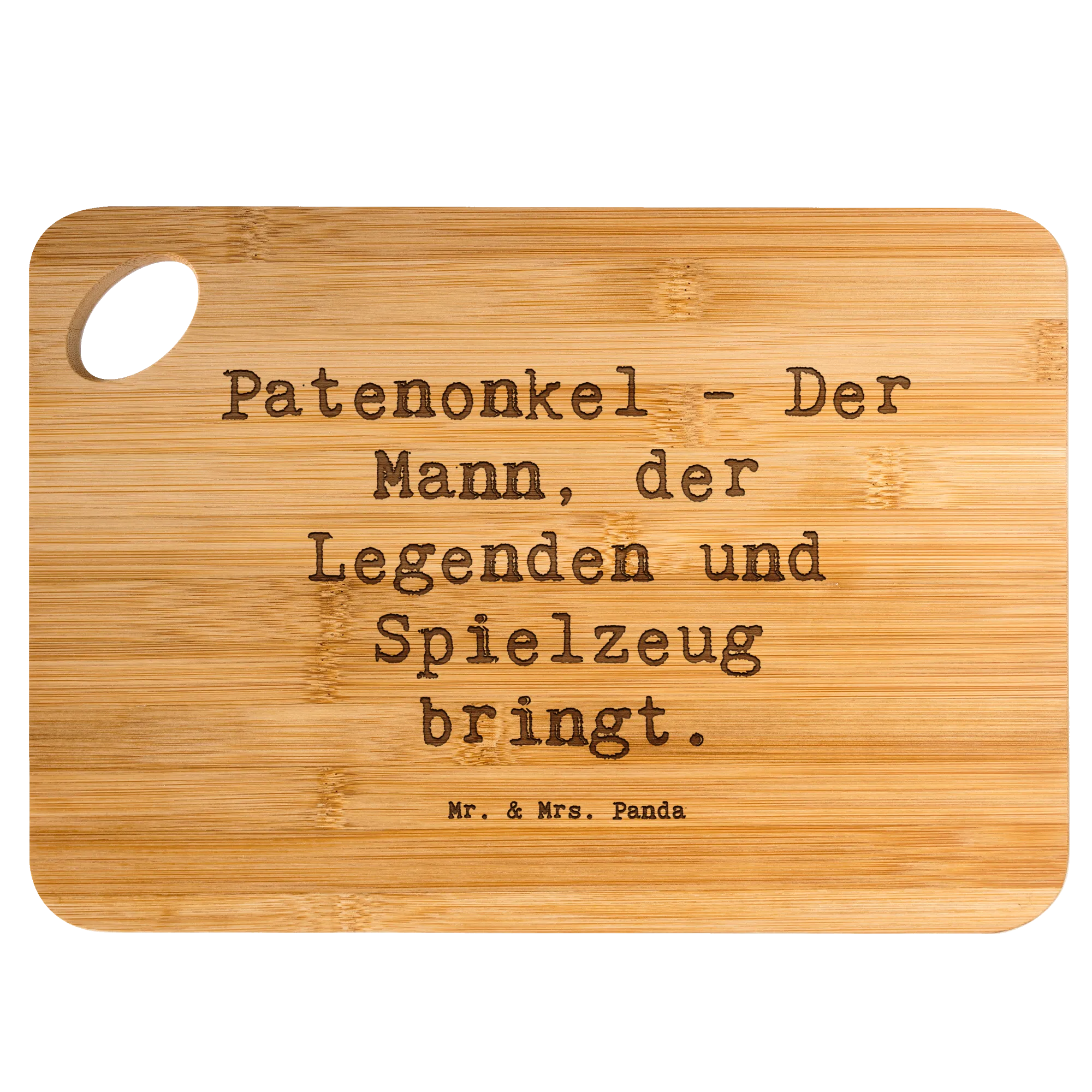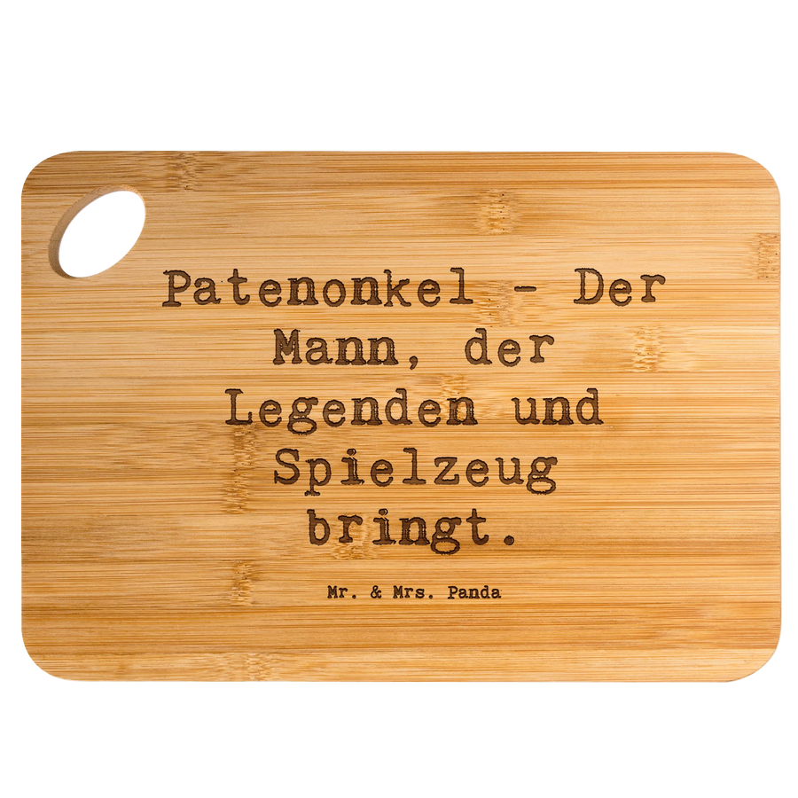 Das Mr. & Mrs. Panda Schneidebrett mit dem frechen Spruch „Patenonkel - Der Mann, der Legenden und Spielzeug bringt.“ ist das perfekte Geschenk, wenn Du etwas Persönliches und zugleich Nützliches suchst. Als Frühstücksbrett, Küchenbrett oder Servierbrett macht es im Alltag eine großartige Figur und erinnert bei jedem Gebrauch an die besondere Verbindung zwischen Patenonkel und Patenkind.