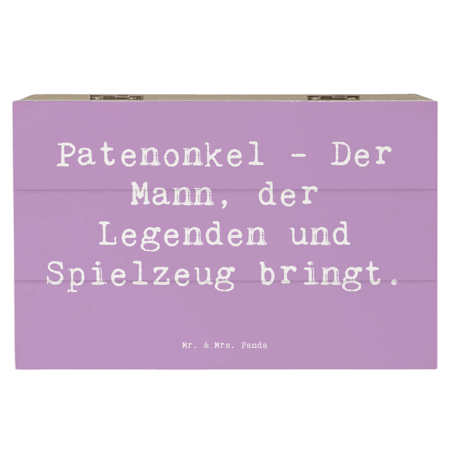 Entdecke die bezaubernde Holzkiste von Mr. & Mrs. Panda, die perfekt geeignet ist, um die wunderbare Beziehung zwischen Patenonkel und Patenkind zu würdigen. Diese wunderschöne Holzkiste hat ein fantastisches Design mit dem Spruch "Patenonkel - Der Mann, der Legenden und Spielzeug bringt." und ist in der Kollektion Familie & Verwandte ein absolutes Must-have.