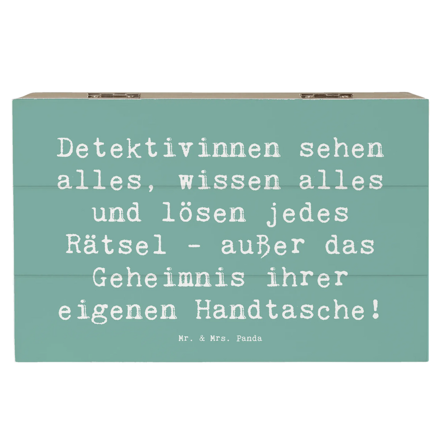 Entdecke die bezaubernde Holzkiste für alle Detektivinnen, die Geheimnisse lieben! Diese stilvolle Kiste von Mr. & Mrs. Panda ist nicht nur praktisch, sondern auch ein wahrer Hingucker. Mit dem lustigen Spruch 'Detektivinnen sehen alles, wissen alles und lösen jedes Rätsel - außer das Geheimnis ihrer eigenen Handtasche!' ist sie das perfekte Geschenk für alle, die mit Leidenschaft ihrer detektivischen Tätigkeit nachgehen.