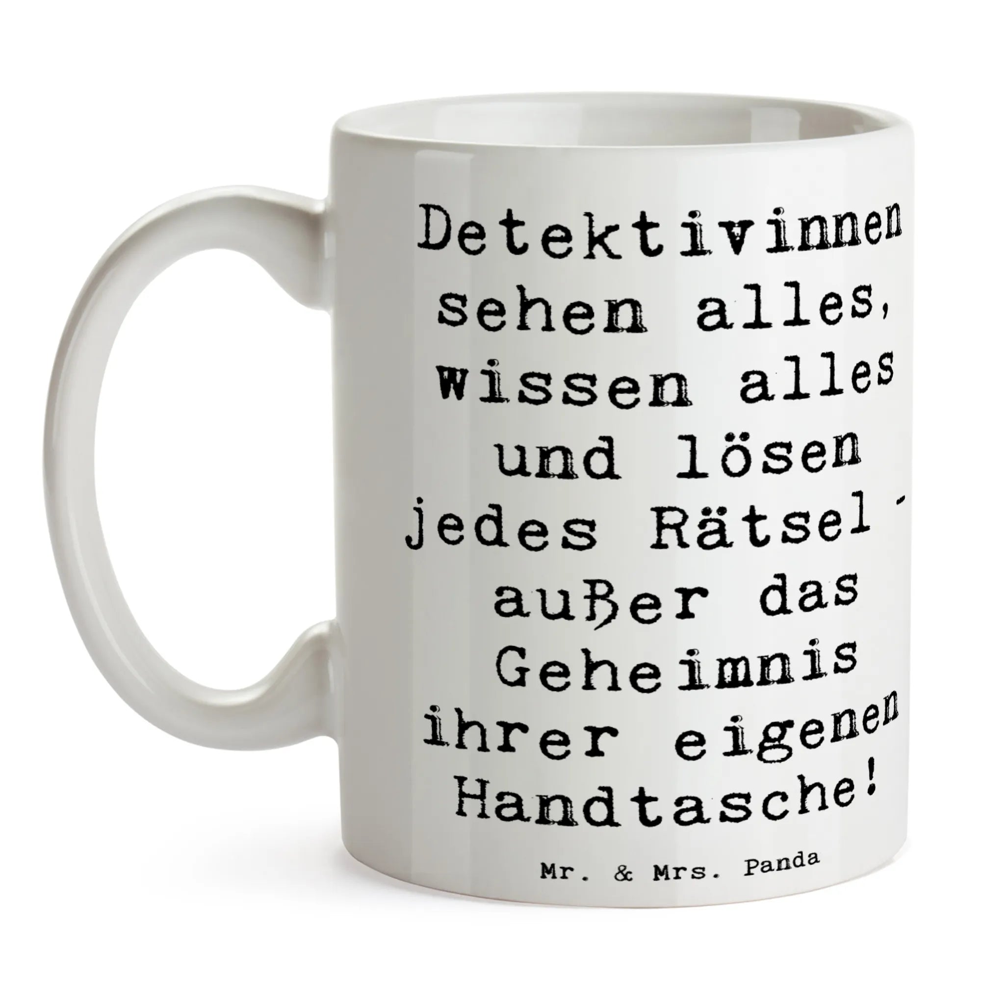 Tasse Spruch Detektivinnen sehen alles, wissen alles und lösen jedes Rätsel - außer das Geheimnis ihrer eigenen Handtasche! Kaffeetasse, Porzellantasse, Tasse mit Motiven, Tasse mit Zitaten, Geschenktasse, Tasse, Keramiktasse, Bürotasse, Teetasse, Beruf, Ausbildung, Jubiläum, Abschied, Rente, Kollege, Kollegin, Geschenk, Schenken, Arbeitskollege, Mitarbeiter, Firma, Danke, Dankeschön