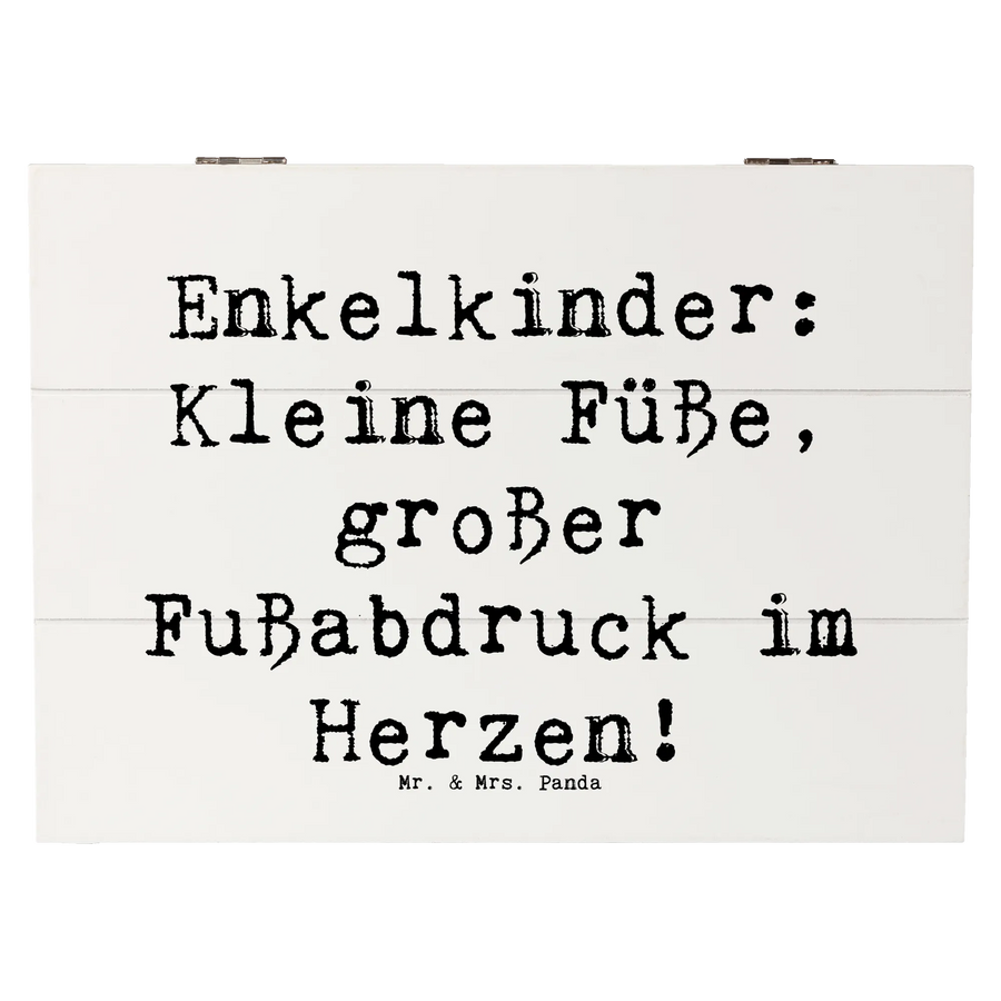Die wunderschöne Holzkiste von Mr. & Mrs. Panda, bedruckt mit dem liebevollen Spruch 'Enkelkinder: Kleine Füße, großer Fußabdruck im Herzen!', ist das perfekte Geschenk für alle Großeltern. Mit den Maßen 180 mm x 250 mm x 150 mm bietet diese stabile Schatulle ausreichend Platz für all die kostbaren Erinnerungen an die Enkelkinder. Ob Fotos, kleine Spielzeuge oder besondere Geschenke – diese Erinnerungskiste ist der ideale Aufbewahrungsort für all die Schätze, die das Herz erwärmen.
