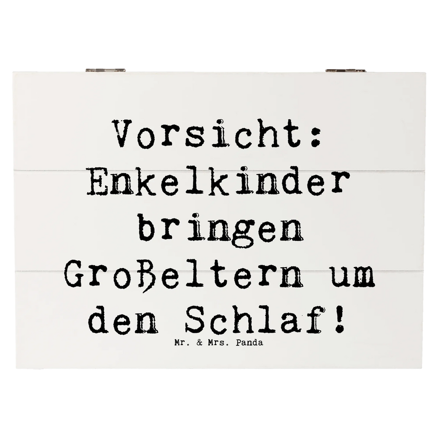 Du suchst das perfekte Geschenk für die Großeltern? Unsere wunderschöne Holzkiste von Mr. & Mrs. Panda mit dem Motto 'Vorsicht: Enkelkinder bringen Großeltern um den Schlaf!' ist nicht nur ein echter Hingucker, sondern auch ein ganz persönlicher Aufbewahrungsort für all die kostbaren Erinnerungen. Ob für die süßen Zeichnungen der Enkelkinder, Fotos von gemeinsamen Ausflügen oder kleine Schätze aus der Kindheit, diese stabile Erinnerungskiste bietet Platz für all die wichtigen Dinge, die das Herz höher schlagen lassen.
