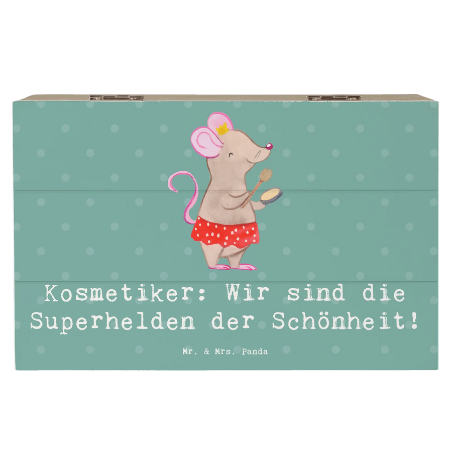 Entdecke die zauberhafte Holzkiste mit dem Motiv "Kosmetiker: Wir sind die Superhelden der Schönheit!" von Mr. & Mrs. Panda!