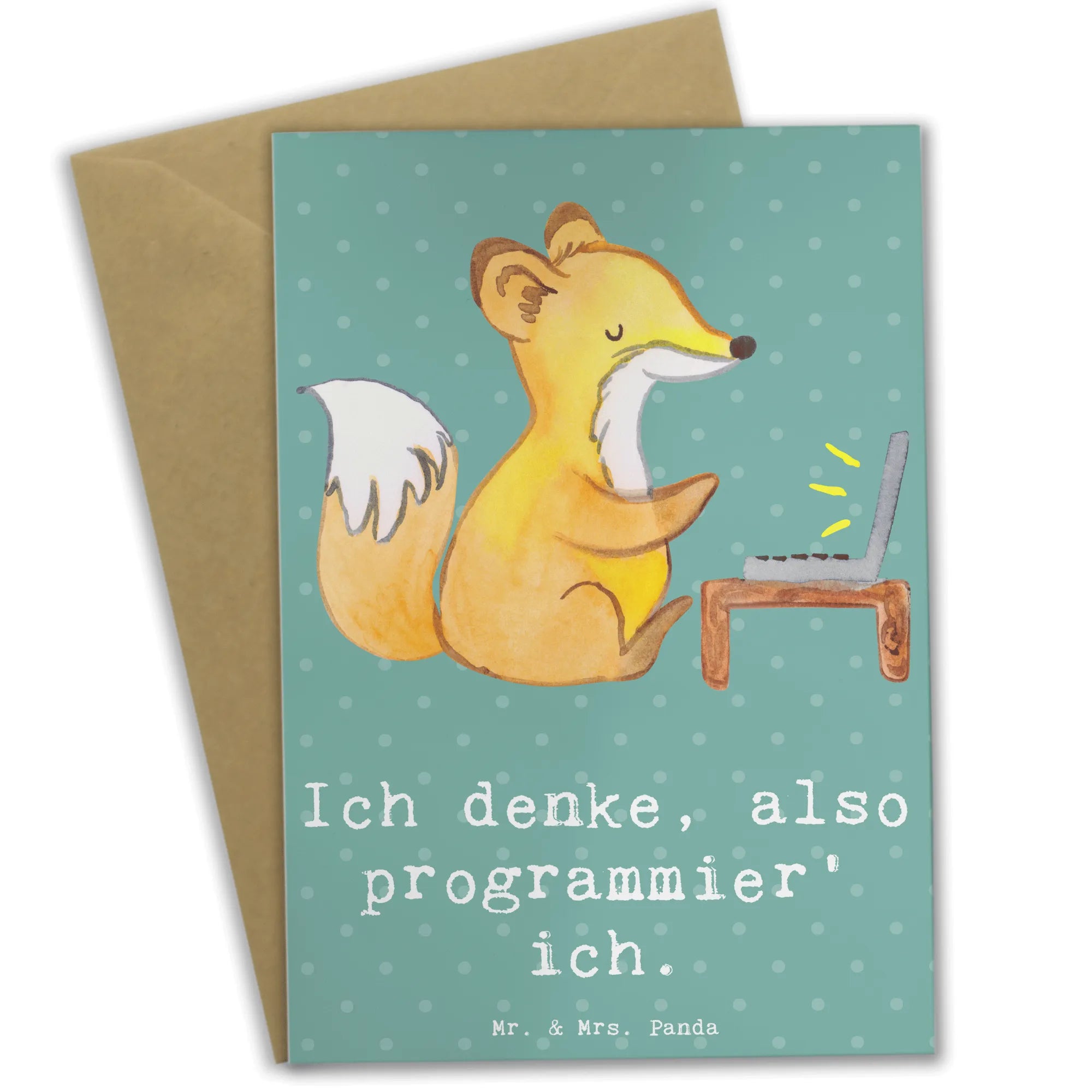 Diese liebevolle Grußkarte von Mr. & Mrs. Panda ist das perfekte Geschenk für alle Softwareentwickler! Ob zur Hochzeit, zur Geburt oder einfach als nette Geste - diese Karte bringt ein Lächeln auf jedes Gesicht. Mit dem charmanten Spruch "Ich denke, also programmier' ich." macht sie sich ideal als Glückwunschkarte für Programmierer, IT-Entwickler oder Tech-Enthusiasten.