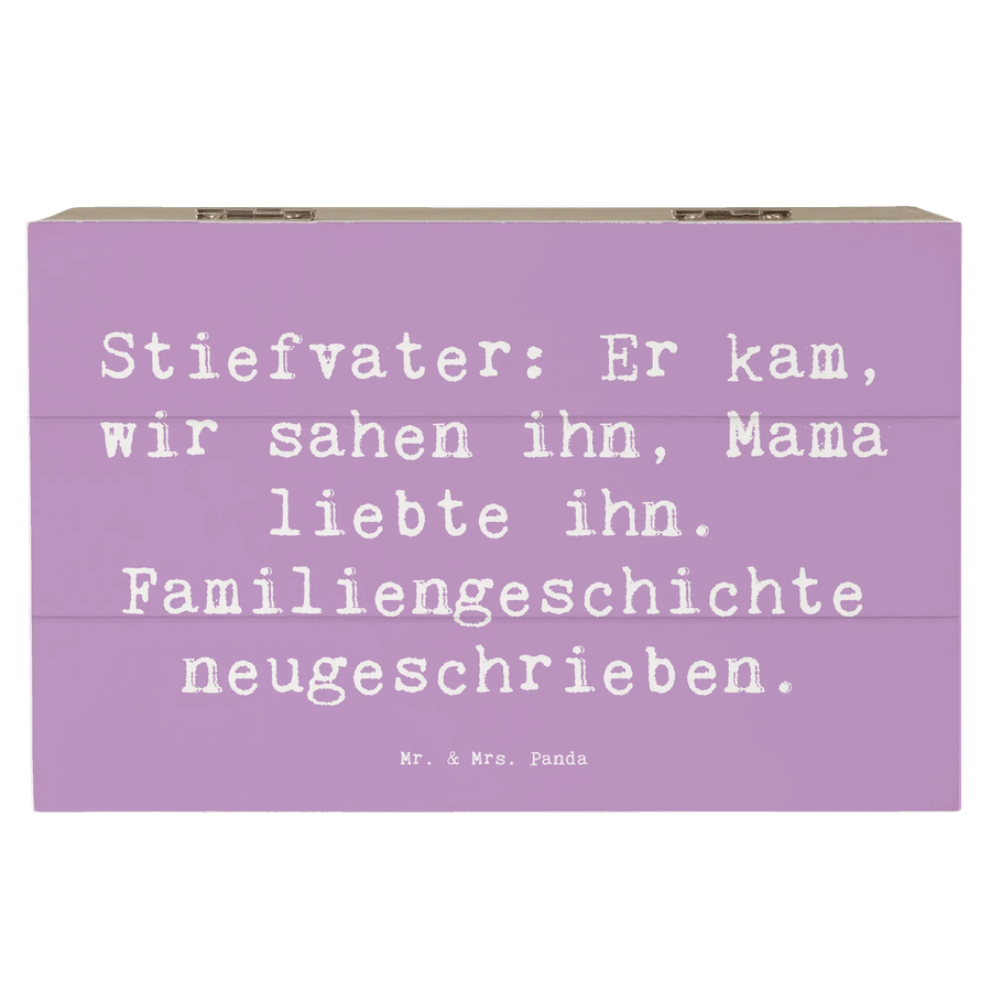 Die wunderschöne Holzkiste von Mr. & Mrs. Panda ist das perfekte Geschenk für Stiefväter und Familienfeiern. Sie ist nicht nur ein stilvolles Aufbewahrungsort, sondern auch eine liebevolle Erinnerungskiste für die besonderen Momente im Leben. Mit dem charmanten Motiv "Stiefvater: Er kam, wir sahen ihn, Mama liebte ihn. Familiengeschichte neugeschrieben." in lebhaften Farben bringt die Kiste Freude und emotionale Wärme in jedes Zuhause.