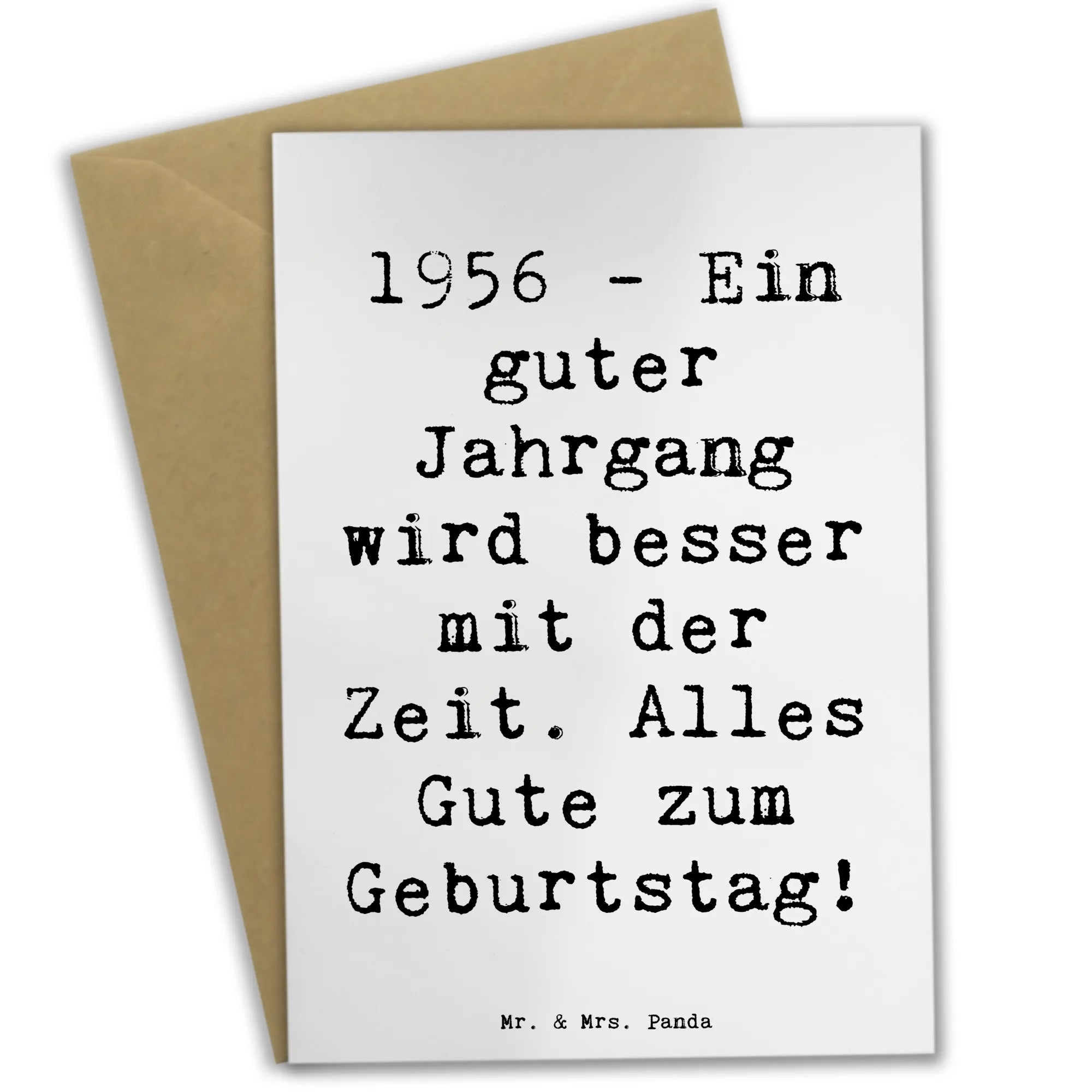 Die Grußkarte "1956 - Ein guter Jahrgang wird besser mit der Zeit. Alles Gute zum Geburtstag!" aus der speziellen Kollektion Geburtstag Geburtsjahr von Mr. & Mrs. Panda ist das perfekte Geschenk für Geburtstagskinder, die in diesem legendären Jahr geboren wurden. Diese wunderschöne und einzigartige Karte ist mit einem liebevollen Spruch bedruckt und bringt garantiert ein Lächeln auf die Gesichter deiner Lieben.