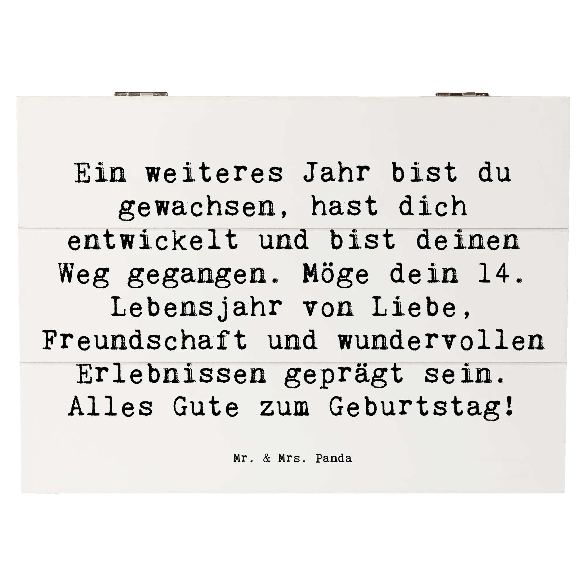 Die wunderschöne Holzkiste von Mr. & Mrs. Panda ist das perfekte Geschenk zum 14. Geburtstag! Mit dem liebevollen Motiv und dem einfühlsamen Spruch, "Ein weiteres Jahr bist du gewachsen, hast dich entwickelt und bist deinen Weg gegangen. Möge dein 14. Lebensjahr von Liebe, Freundschaft und wundervollen Erlebnissen geprägt sein. Alles Gute zum Geburtstag!", wird diese Kiste zu einer besonderen Erinnerung für das Geburtstagskind.