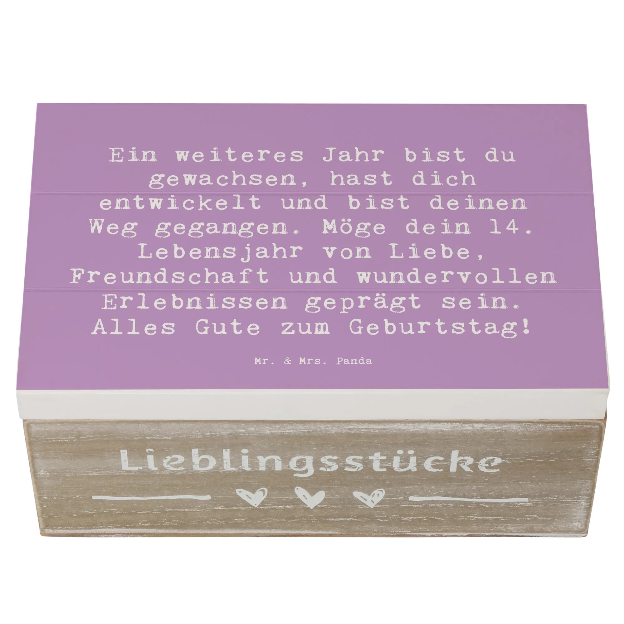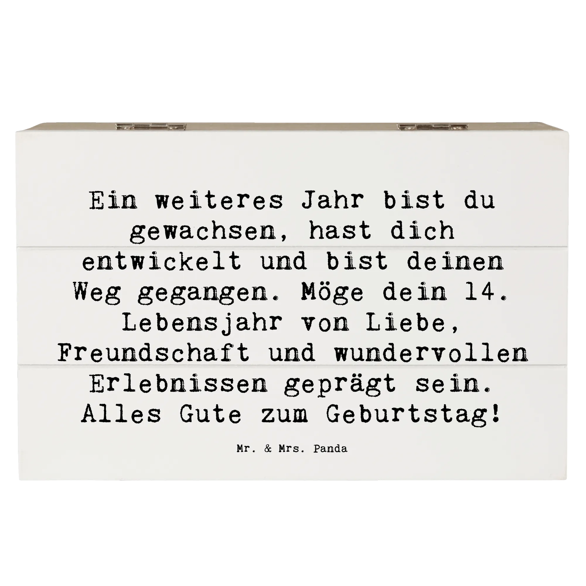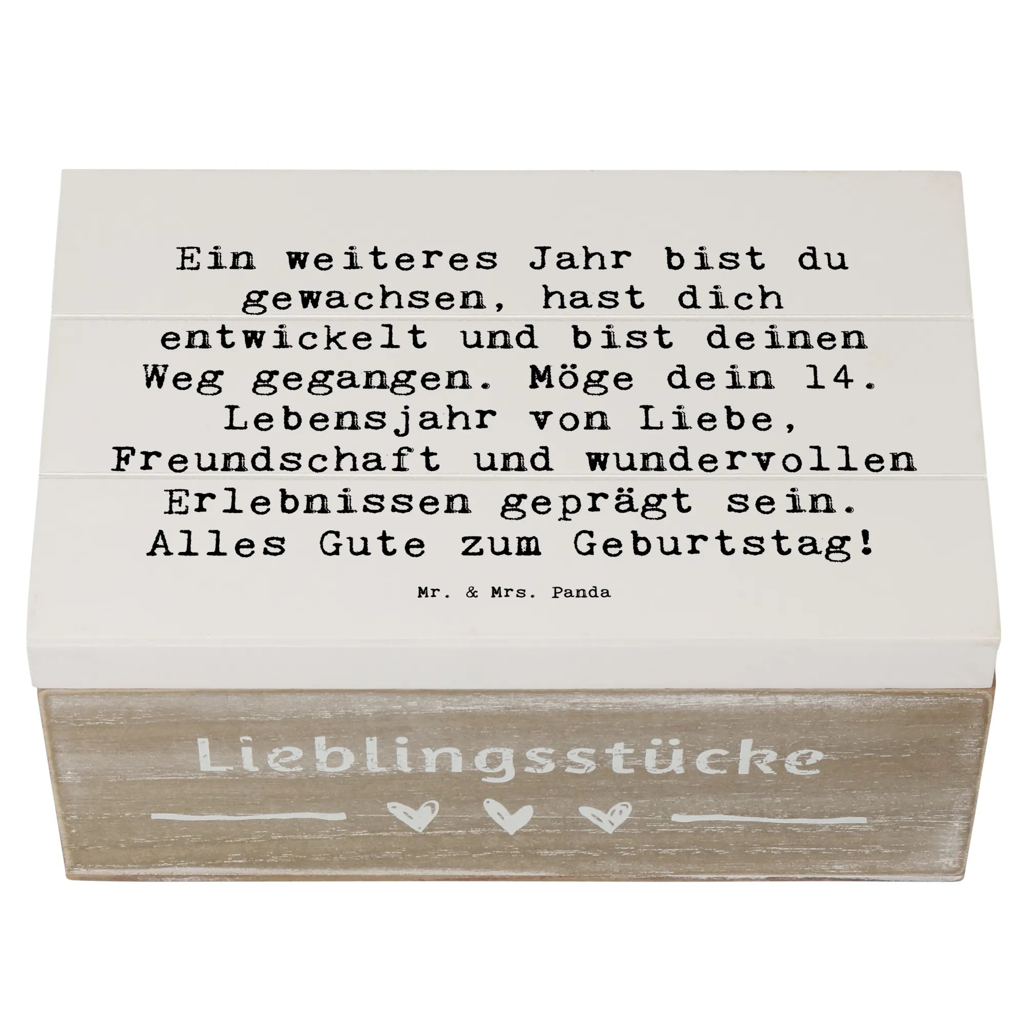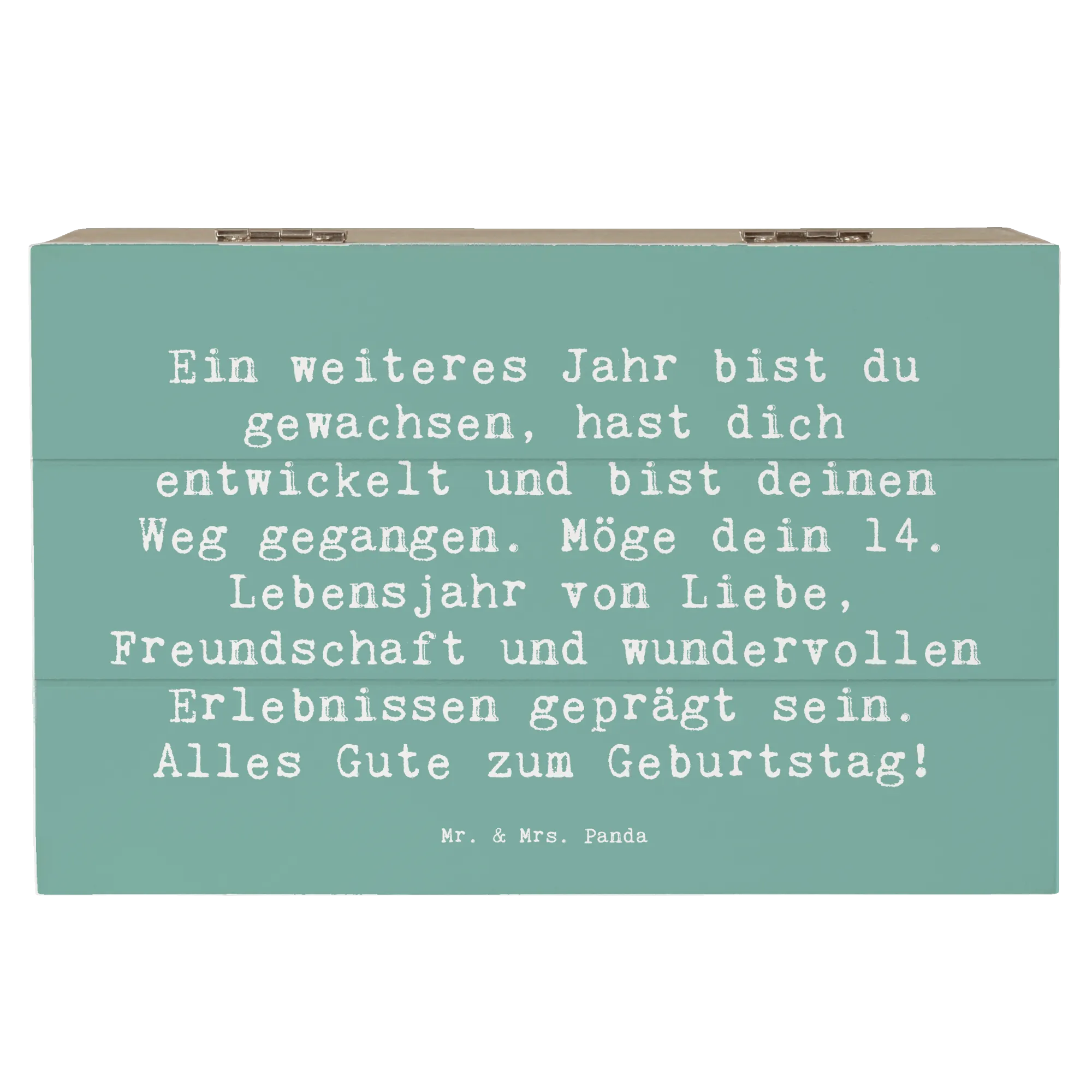 Die wunderschöne Holzkiste von Mr. & Mrs. Panda ist das perfekte Geschenk zum 14. Geburtstag! 🎉 Sie ist von liebevollen Motiven und einem besonderen Spruch gestaltet: ‚Ein weiteres Jahr bist du gewachsen, hast dich entwickelt und bist deinen Weg gegangen. Möge dein 14. Lebensjahr von Liebe, Freundschaft und wundervollen Erlebnissen geprägt sein. Alles Gute zum Geburtstag!‘