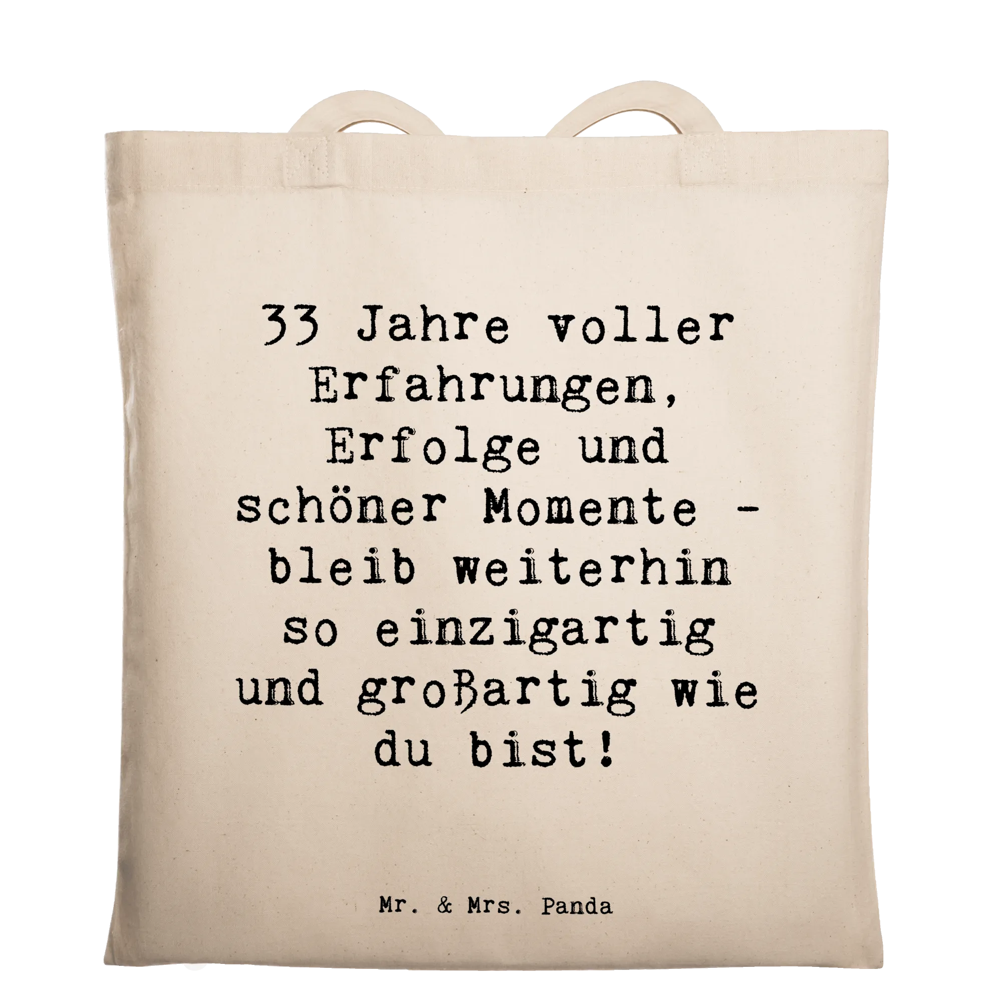 Die wunderschöne Tragetasche von Mr. & Mrs. Panda zum 33. Geburtstag ist mehr als nur ein praktisches Accessoire; sie ist ein liebevoll gestaltetes Geschenk, das Persönlichkeit und Lebensfreude versprüht. Mit dem originellen Slogan „33 Jahre voller Erfahrungen, Erfolge und schöner Momente - bleib weiterhin so einzigartig und großartig wie du bist!“ gibt diese Tasche dem 33. Geburtstag eine ganz besondere Note. Egal, ob für die beste Freundin, den Bruder oder die Mutter: Diese Tragetasche eignet sich ideal für jeden, der seinen besonderen Tag gebührend feiern möchte.