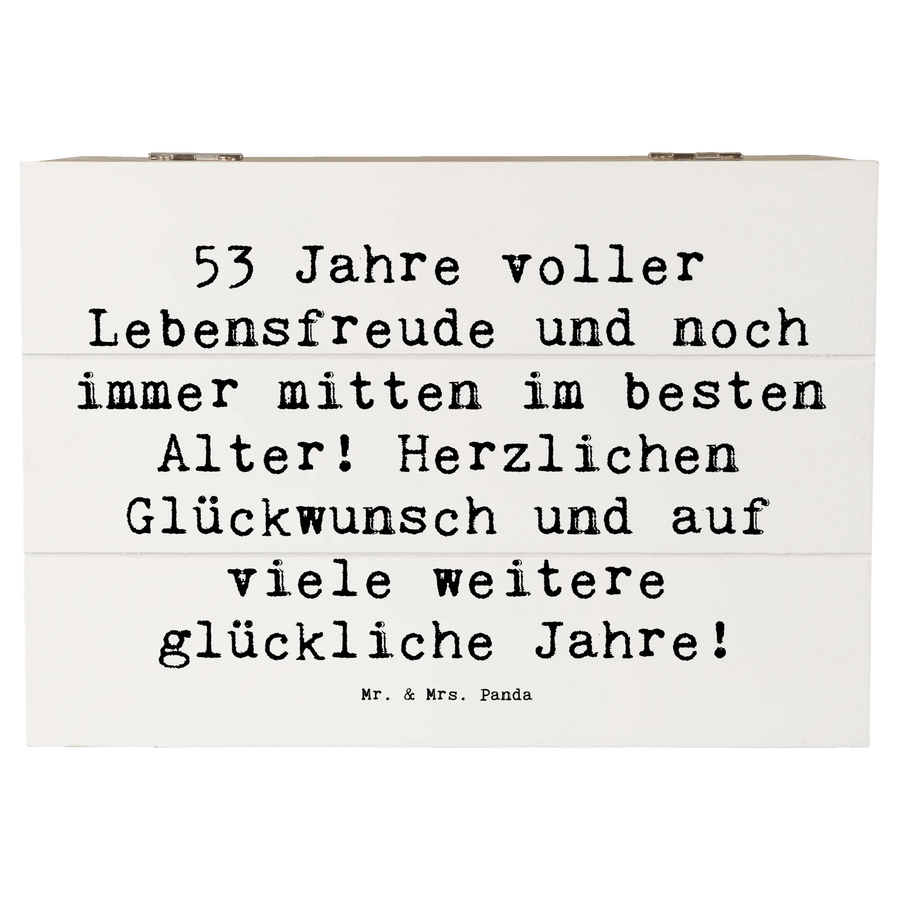 Die wunderschöne Holzkiste von Mr. & Mrs. Panda zum 53. Geburtstag ist das perfekte Geschenk für das Geburtstagskind, das voller Lebensfreude stecken soll! Mit dem liebevollen Spruch "53 Jahre voller Lebensfreude und noch immer mitten im besten Alter! Herzlichen Glückwunsch und auf viele weitere glückliche Jahre!" wird diese Kiste zu einem ganz besonderen Hingucker.
