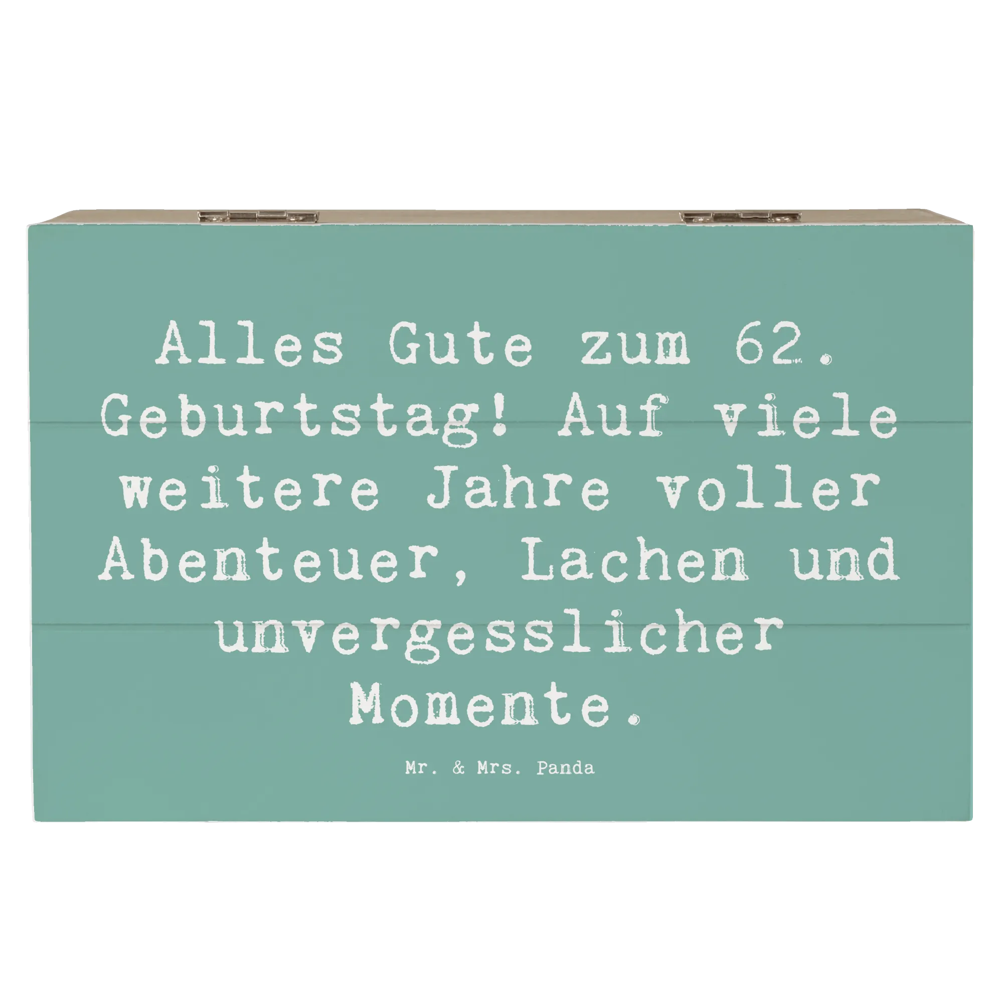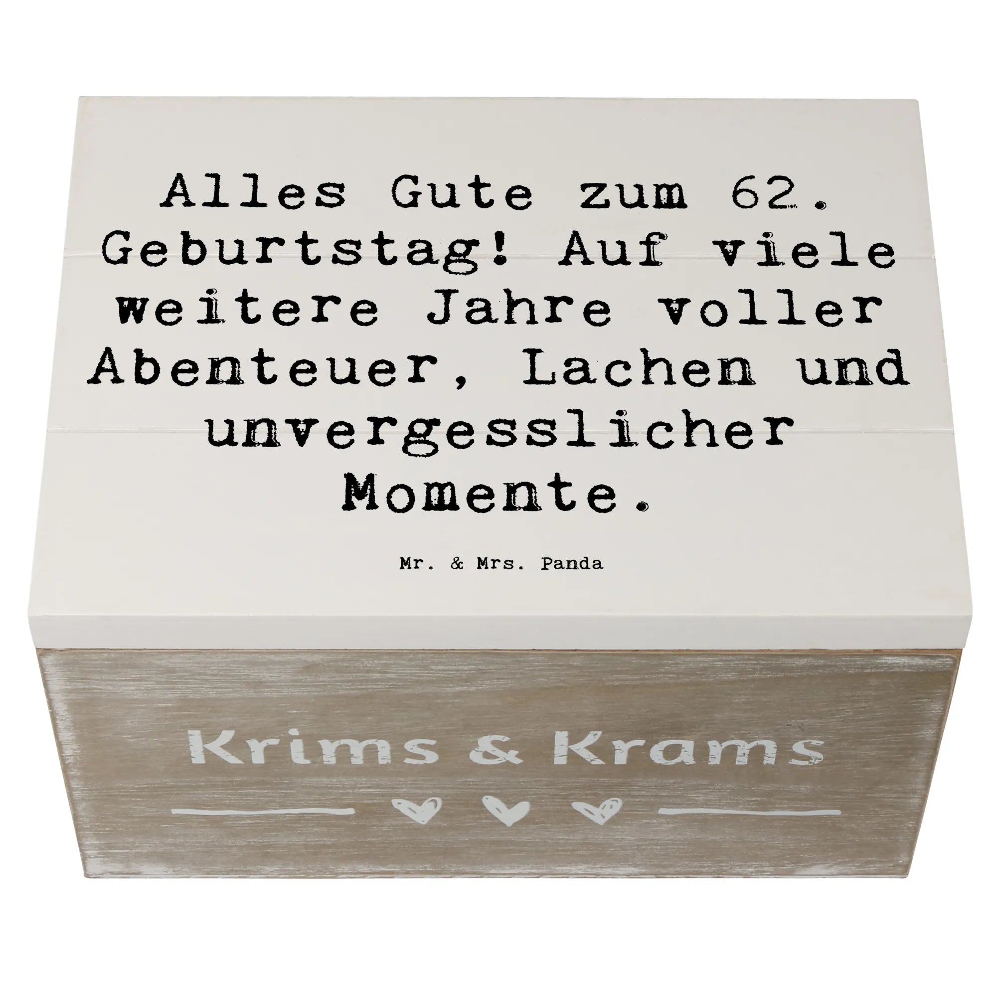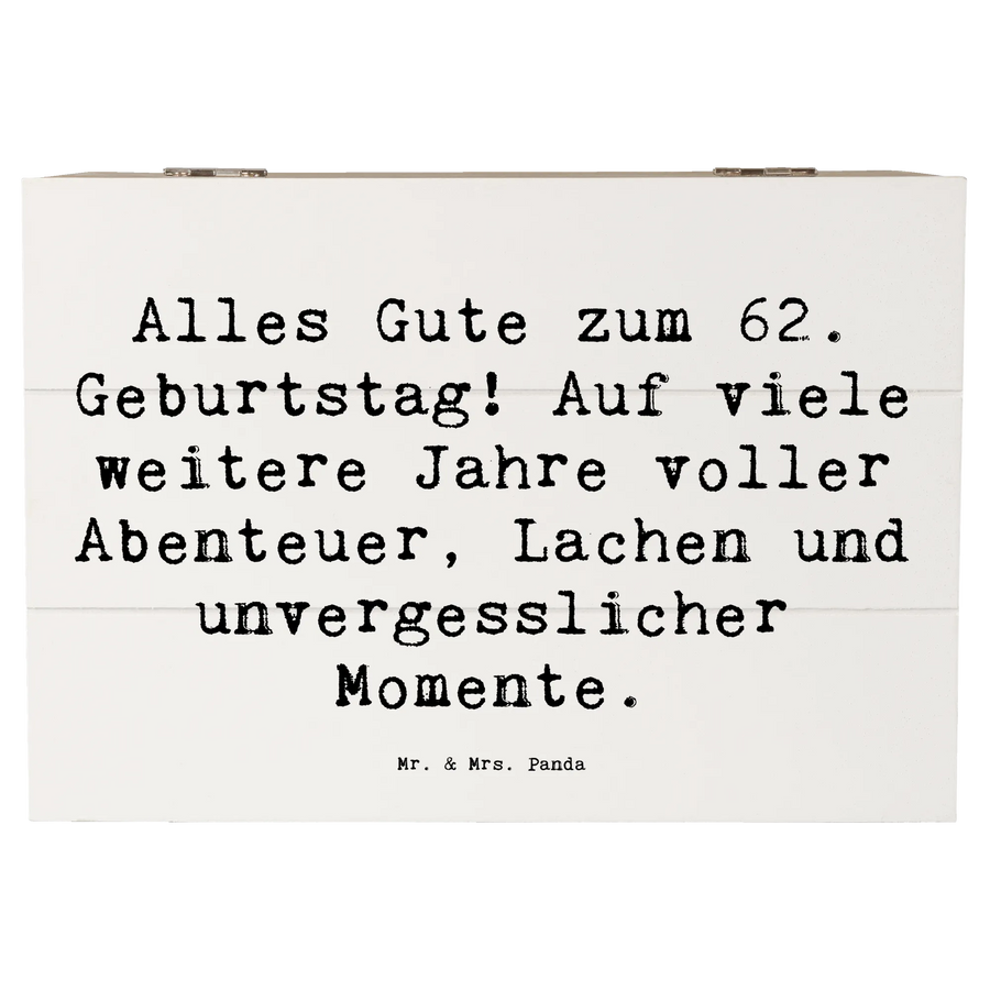 Entdecke die wundervolle Holzkiste zum 62. Geburtstag von Mr. & Mrs. Panda! 🎉 Diese einzigartige Kiste ist der perfekte Aufbewahrungsort für all deine kostbaren Erinnerungen und Schätze. Mit ihrer liebevollen Gestaltung und dem tollen Spruch "Alles Gute zum 62. Geburtstag! Auf viele weitere Jahre voller Abenteuer, Lachen und unvergesslicher Momente." hast du ein Geschenk, das von Herzen kommt.