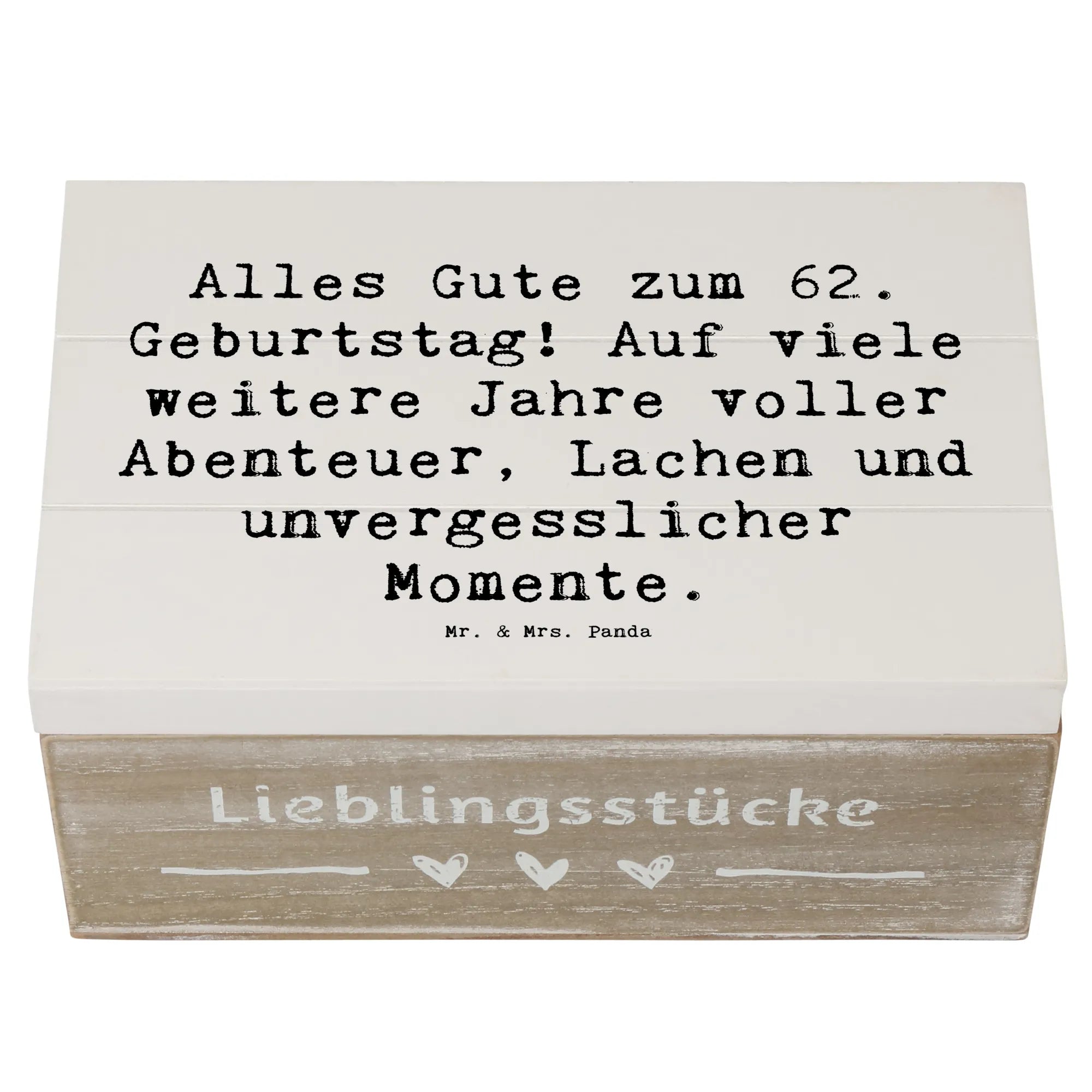 Wenn du auf der Suche nach dem perfekten Geschenk für den 62. Geburtstag bist, ist die Holzkiste von Mr. & Mrs. Panda genau das, was du brauchst! Diese wunderschöne Holzkiste ist nicht nur ein absoluter Blickfang, sondern auch ein wunderbarer Aufbewahrungsort für all die besonderen Erinnerungen, die du über die Jahre gesammelt hast. Mit liebevollen Sprüchen und handgezeichneten Motiven zaubert sie ein Lächeln auf das Gesicht des Beschenkten.
