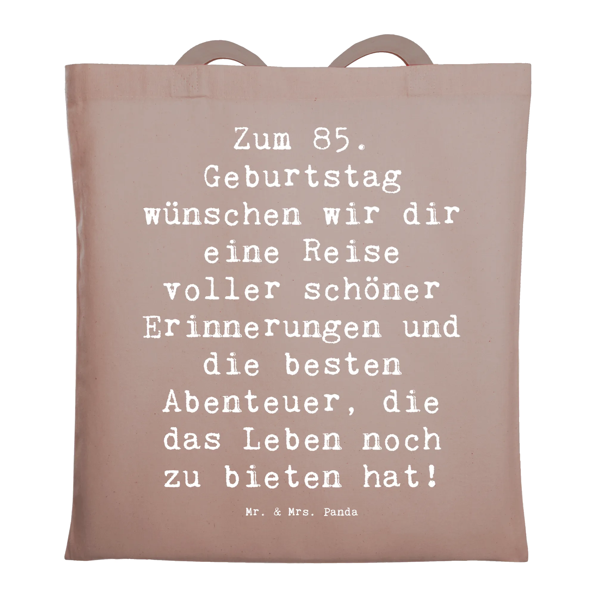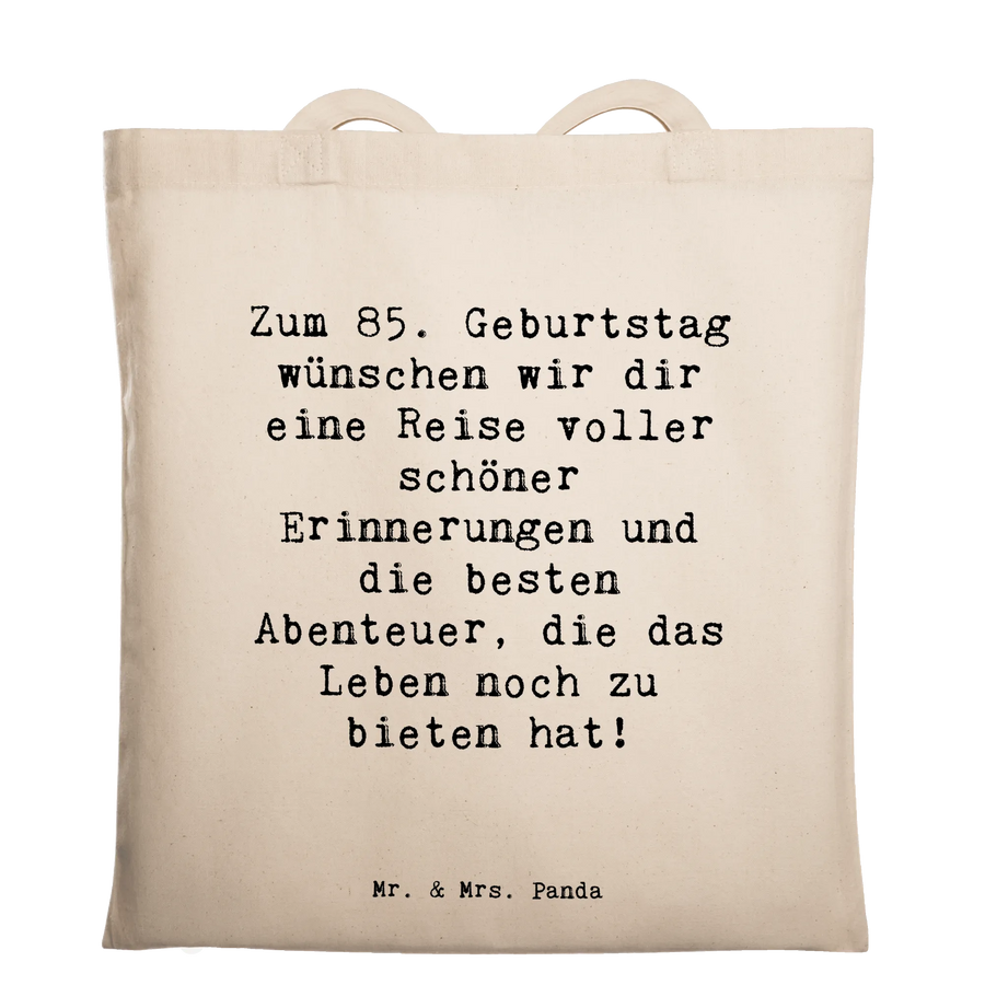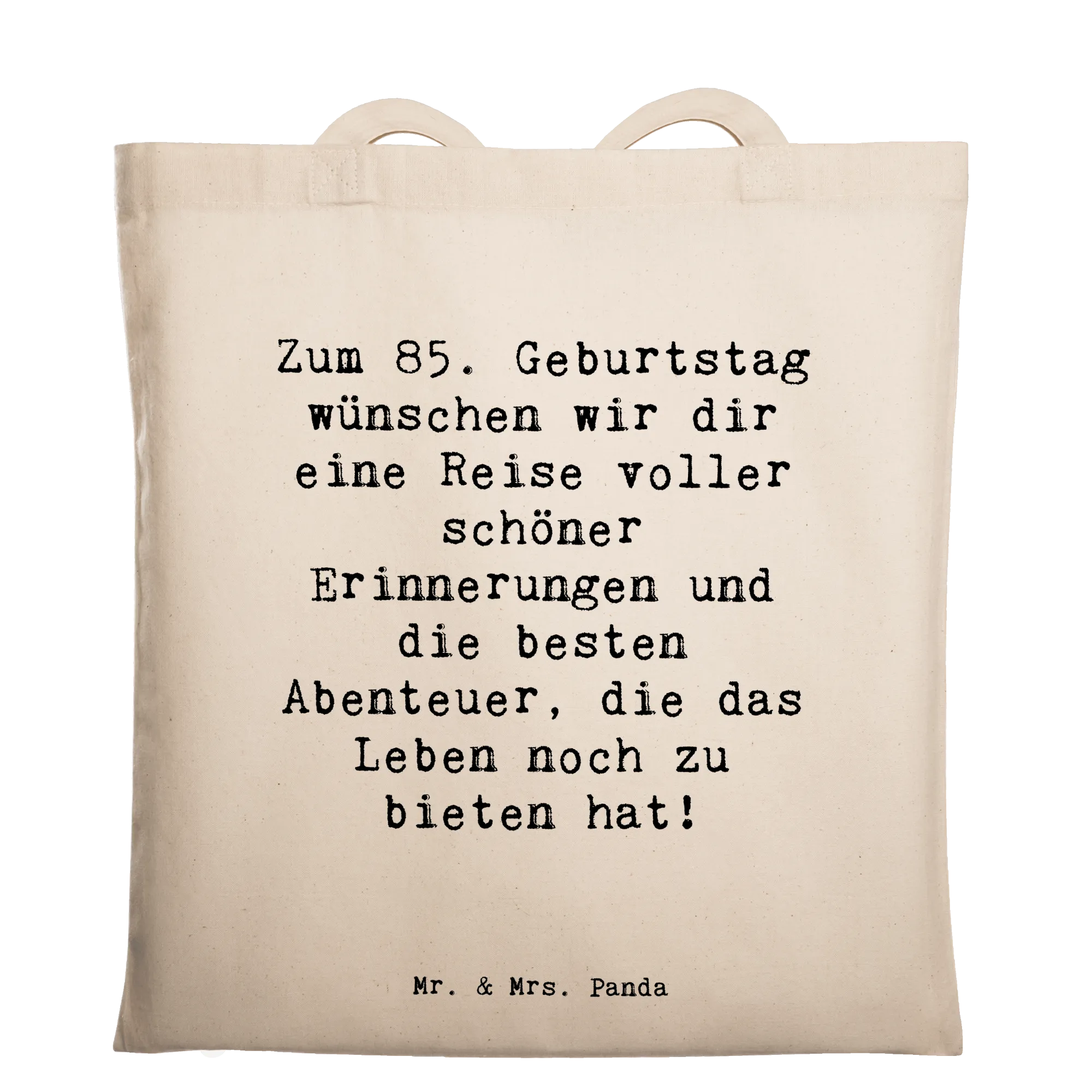 Verschenke Freude zum 85. Geburtstag 🎉 – mit dieser liebevoll gestalteten Tragetasche von Mr. & Mrs. Panda machst du einen besonderen Menschen glücklich. Unser Motiv aus der Geburtstagskollektion „Geburtstag Alter" trägt den warmen Spruch: „Zum 85. Geburtstag wünschen wir dir eine Reise voller schöner Erinnerungen und die besten Abenteuer, die das Leben noch zu bieten hat!” – ein herzlicher Gruß, der direkt ins Herz trifft.