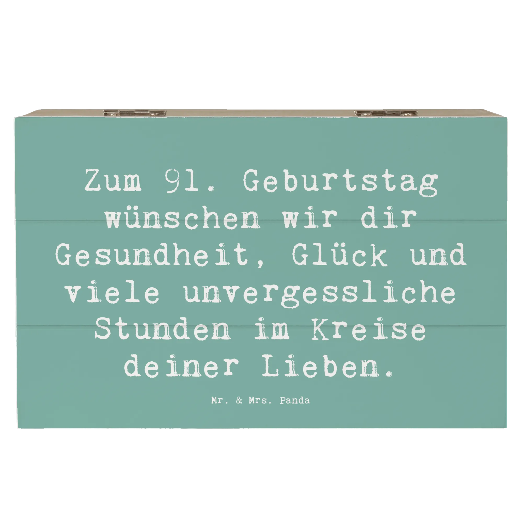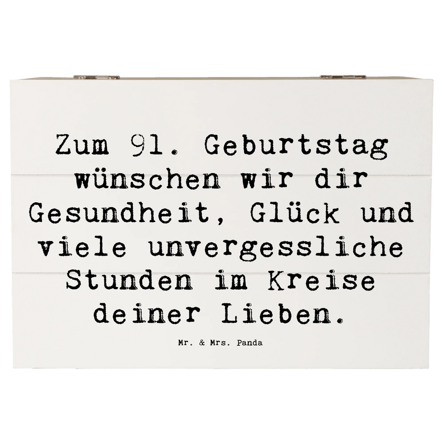 Die wunderschöne Holzkiste von Mr. & Mrs. Panda ist das perfekte Geschenk zum 91. Geburtstag! Diese entzückende Erinnerungskiste ist nicht nur ein Blickfang, sondern auch der ideale Aufbewahrungsort für all die Schätze, die du in deinem Leben gesammelt hast. Ob Fotos, besondere Erinnerungen oder kleine Geschenke – alles findet in dieser stabilen und robusten Kiste einen besonderen Platz. Bedruckt mit dem herzlichen Slogan „Zum 91. Geburtstag wünschen wir dir Gesundheit, Glück und viele unvergessliche Stunden im Kreise deiner Lieben“ strahlt die Kiste eine liebevolle Atmosphäre aus, die jeden Geburtstagsfeierlichkeiten einen Hauch von Magie verleiht.