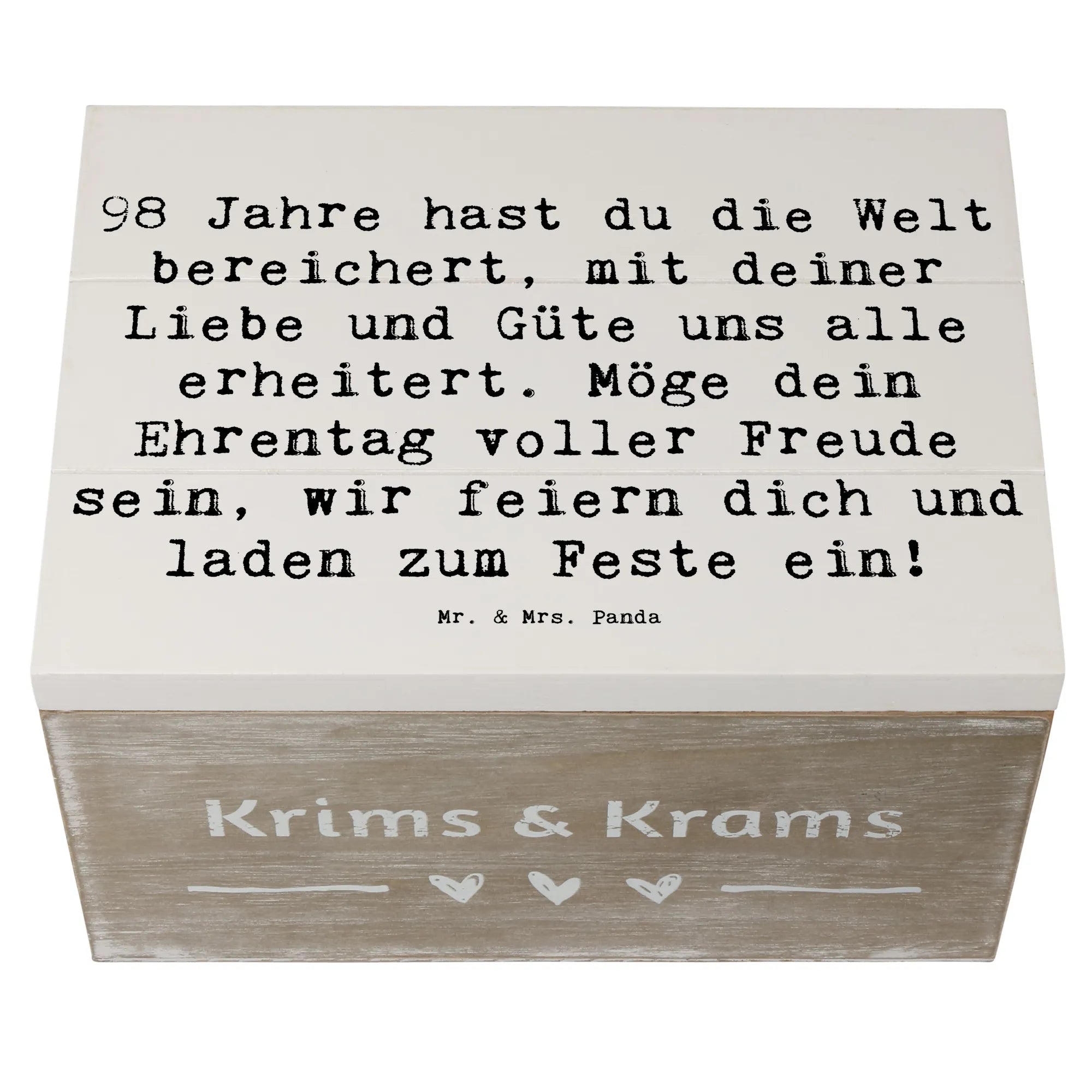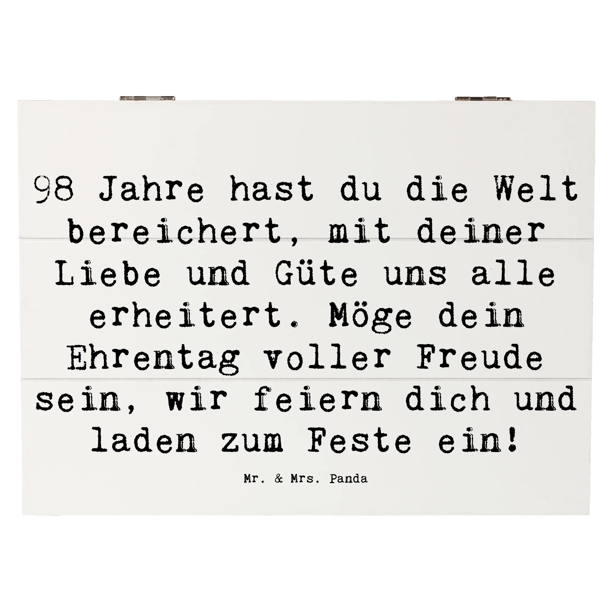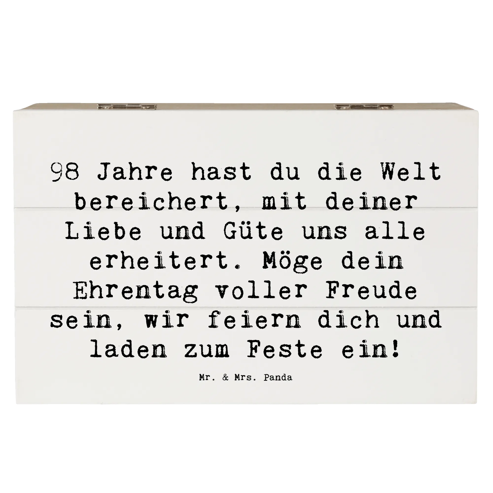 Die wunderschöne Holzkiste von Mr. & Mrs. Panda ist das perfekte Geschenk zum 98. Geburtstag! 🎉 Sie ist mit dem liebevollen Spruch "98 Jahre hast du die Welt bereichert, mit deiner Liebe und Güte uns alle erheitert. Möge dein Ehrentag voller Freude sein, wir feiern dich und laden zum Feste ein!" bedruckt und sorgt für große Freude, wenn das besondere Geburtstagskind seinen Ehrentag feiert.