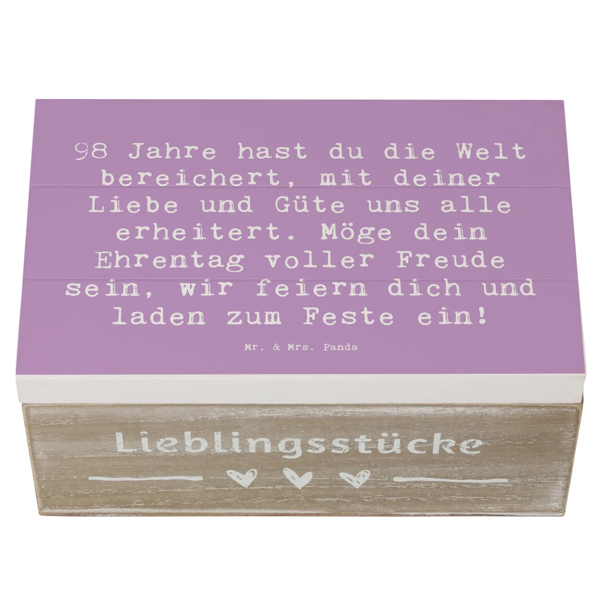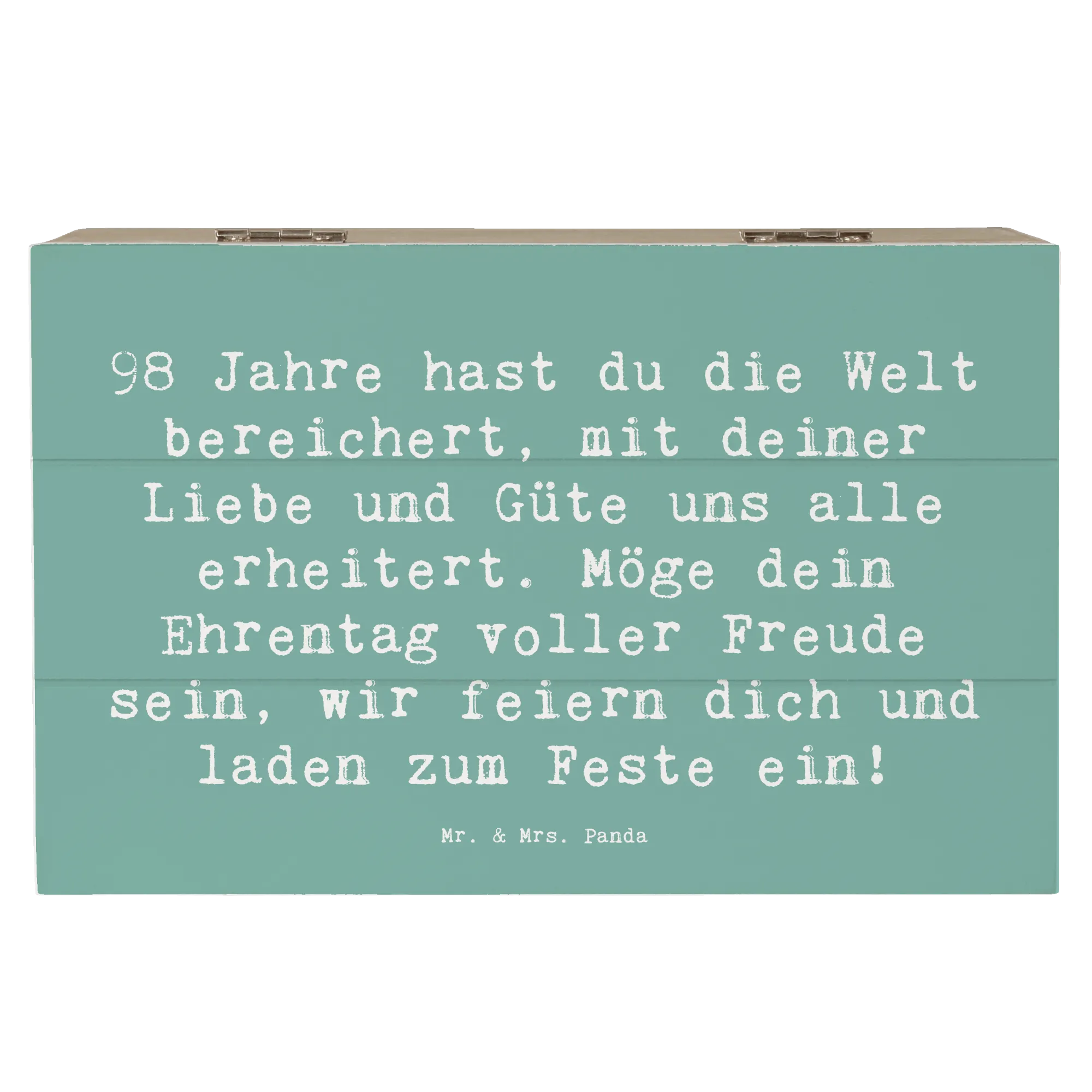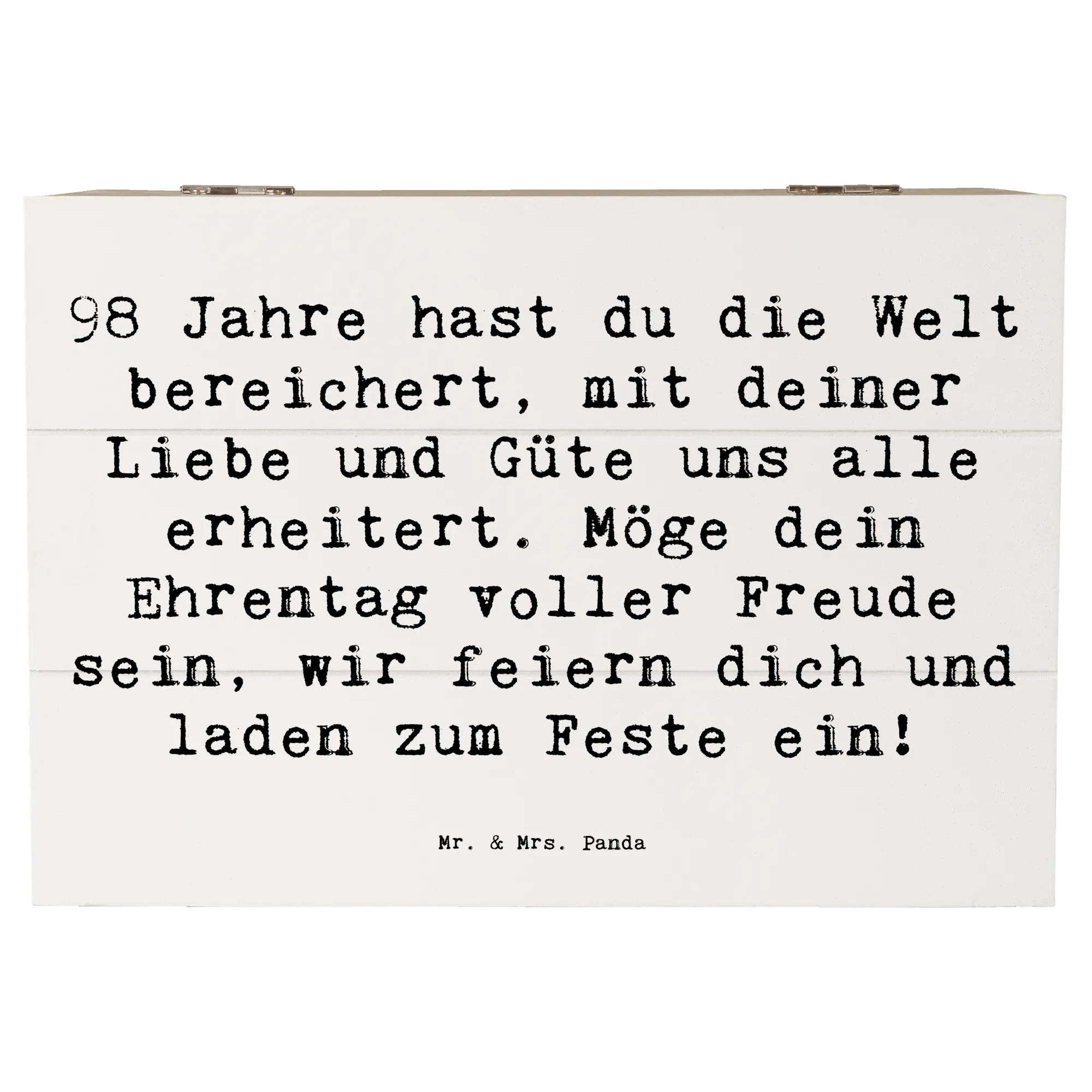 Die wunderschöne Holzkiste von Mr. & Mrs. Panda ist das perfekte Geschenk zum 98. Geburtstag! 🎉 Sie ist mit dem liebevollen Spruch "98 Jahre hast du die Welt bereichert, mit deiner Liebe und Güte uns alle erheitert. Möge dein Ehrentag voller Freude sein, wir feiern dich und laden zum Feste ein!" bedruckt und sorgt für große Freude, wenn das besondere Geburtstagskind seinen Ehrentag feiert.