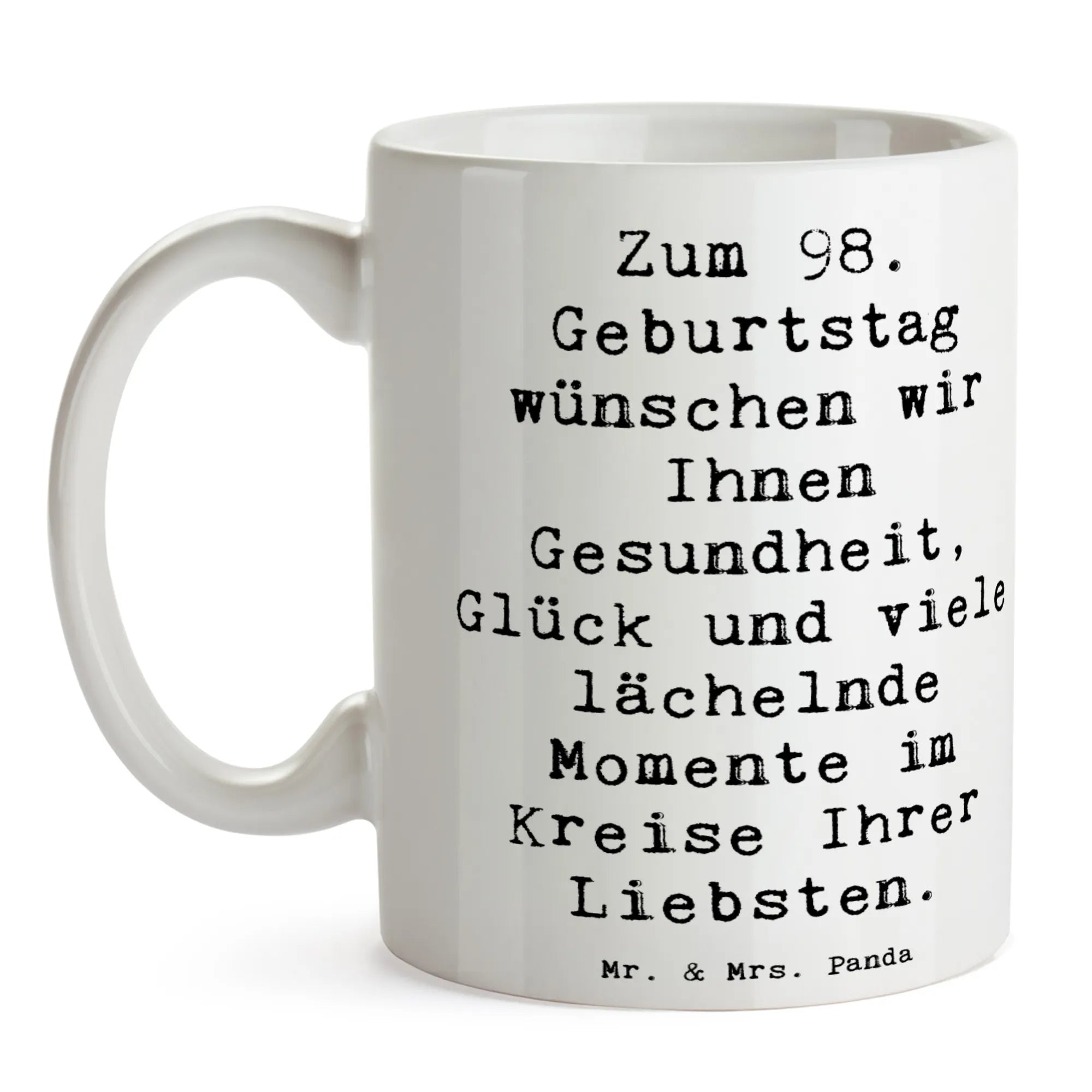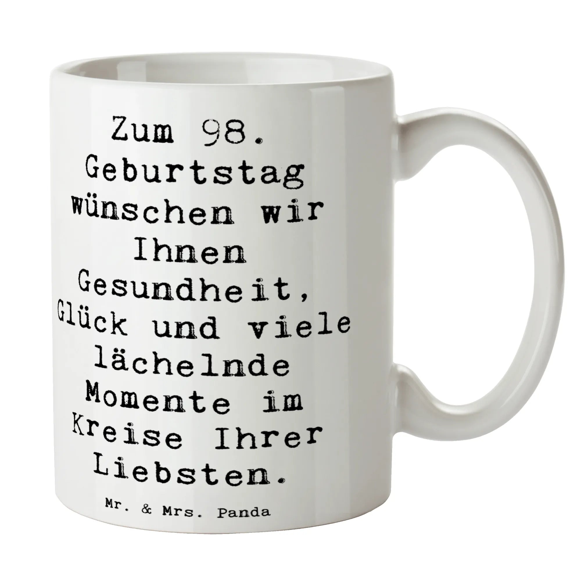 Suchst du das perfekte Geschenk zum 98. Geburtstag? Die wunderschöne Tasse von Mr. & Mrs. Panda ist genau das richtige! Mit dem liebevollen Spruch "Zum 98. Geburtstag wünschen wir Ihnen Gesundheit, Glück und viele lächelnde Momente im Kreise Ihrer Liebsten" wird diese Tasse zu einem unvergesslichen Geschenk für jeden Jubilar. Hergestellt aus hochwertiger Keramik, ist diese Kaffeetasse sowohl mikrowellengeeignet als auch spülmaschinenfest. Damit bleibt sie auch nach vielen Jahren und zahlreichen Kaffeepausen immer in bestem Zustand. Sie ist nicht nur praktisch, sondern verleiht jedem Frühstückstisch einen besonderen Charme und bringt Freude in jeden Kaffeeklatsch.
