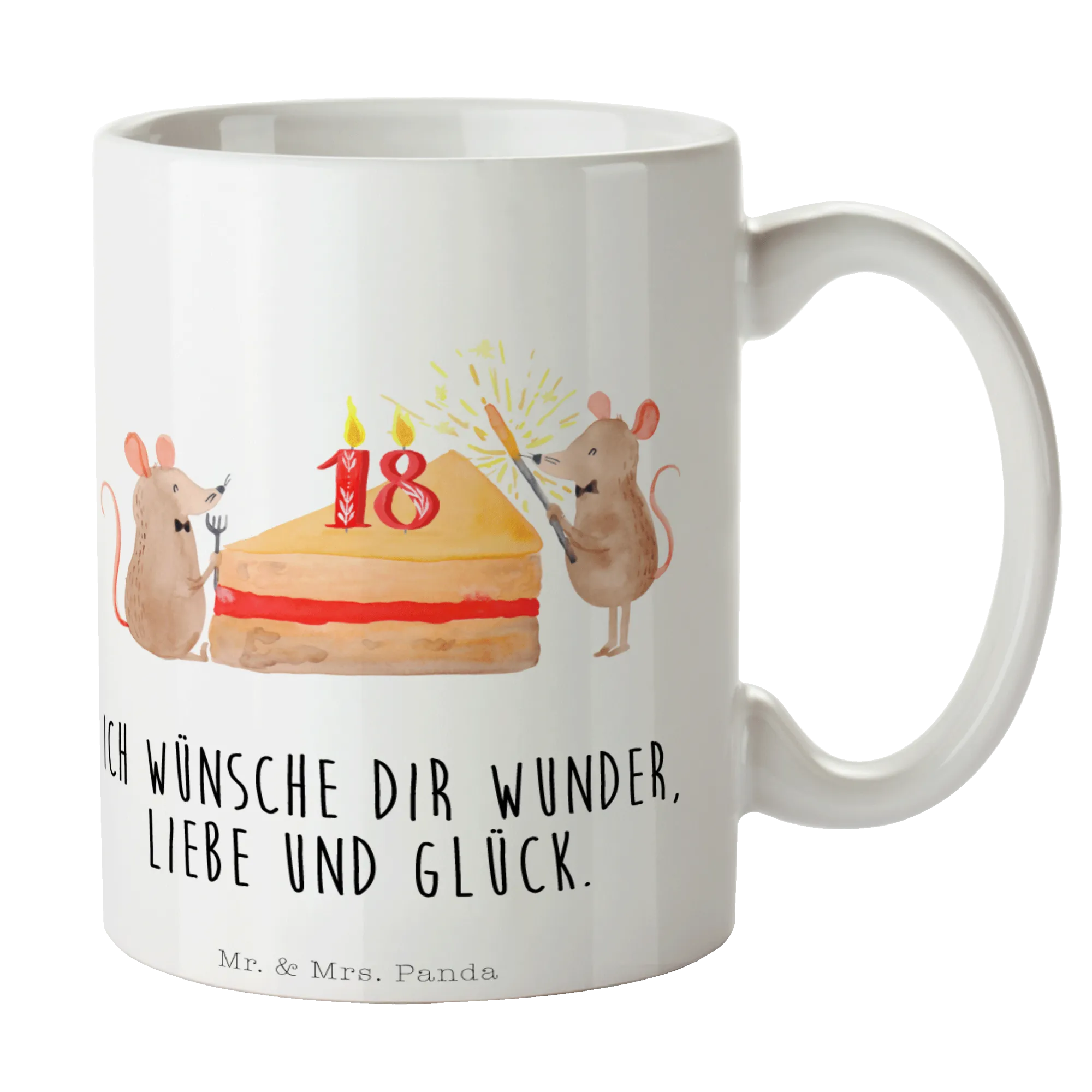 Die Mr. & Mrs. Panda Tasse zum 18. Geburtstag mit dem niedlichen Motiv der Mäuse vor einer köstlichen Geburtstagstorte ist das perfekte Geschenk für jeden, der seinen besonderen Tag feiert. Diese wunderschöne Keramiktasse ist nicht nur funktional, sondern bringt auch ein großes Lächeln auf die Gesichter deiner Liebsten. Die beiden kleinen Mäuse, die Wunderkerzen in den Händen halten, strahlen pure Freude aus und verbreiten die wunderschöne Botschaft 'Ich wünsche dir Wunder, Liebe und Glück'. Der 18. Geburtstag ist ein ganz neuer Lebensabschnitt, und was gibt es Besseres, als diesen bedeutsamen Tag mit einem persönlichen Geschenk zu feiern?