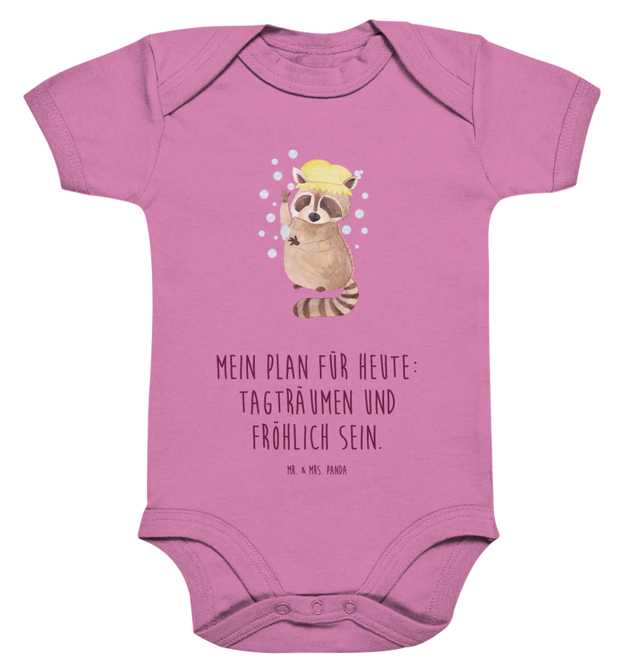 Unser Organic Babybody mit dem niedlichen Waschbär-Motiv ist ein kleines Geschenk fürs Herz. Der liebevoll gezeichnete Waschbär plantscht fröhlich unter der Dusche und erzählt mit dem Spruch „Mein Plan für heute: Tagträumen und fröhlich sein.“ eine zarte Geschichte von Leichtigkeit und liebevollen Momenten.