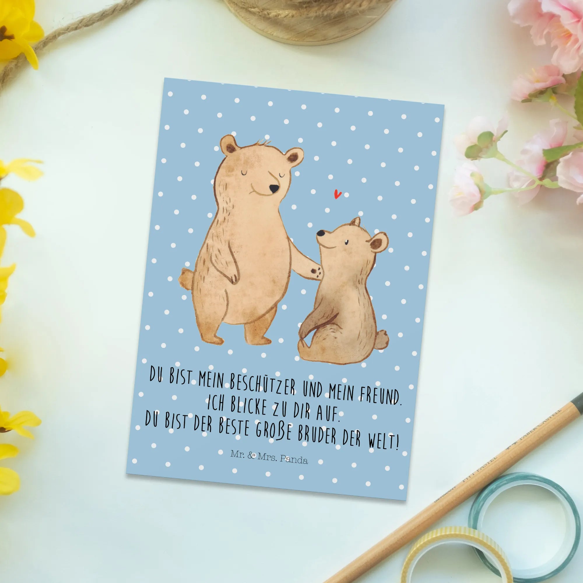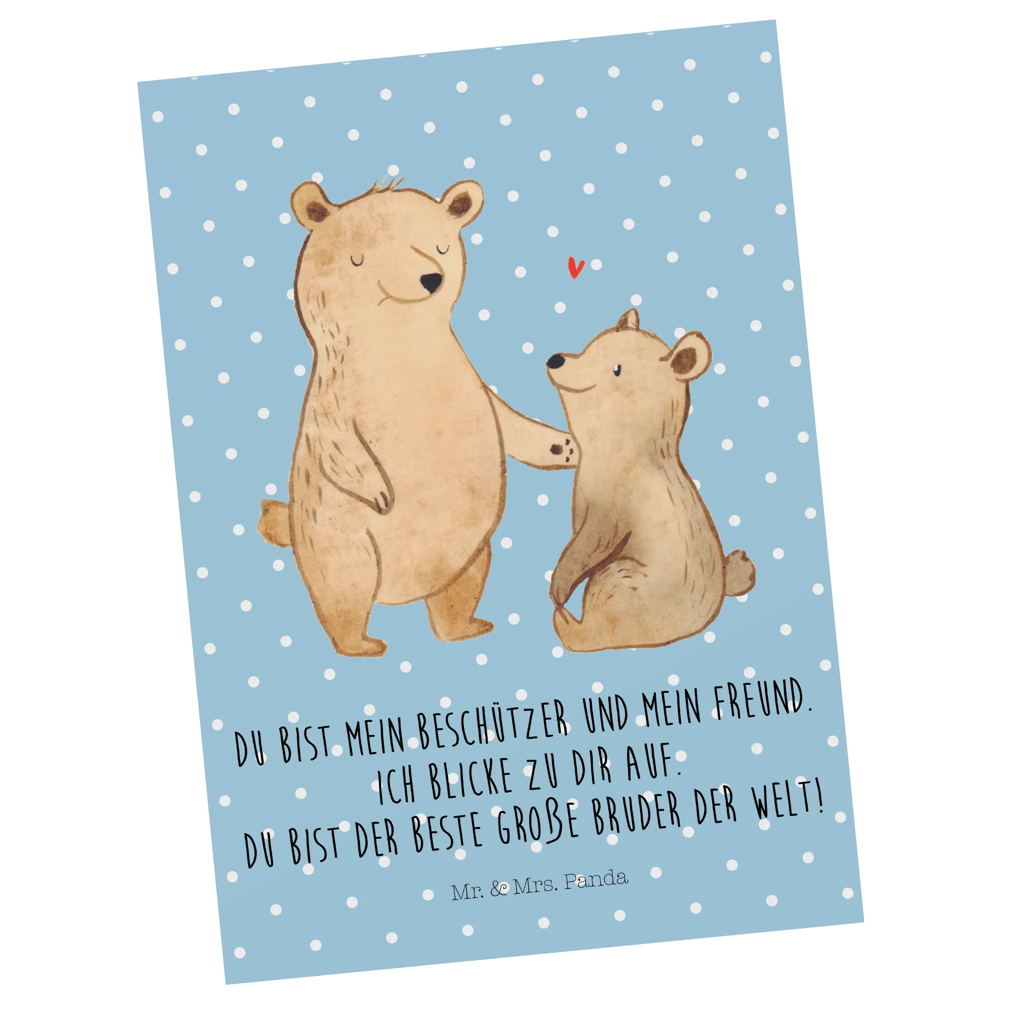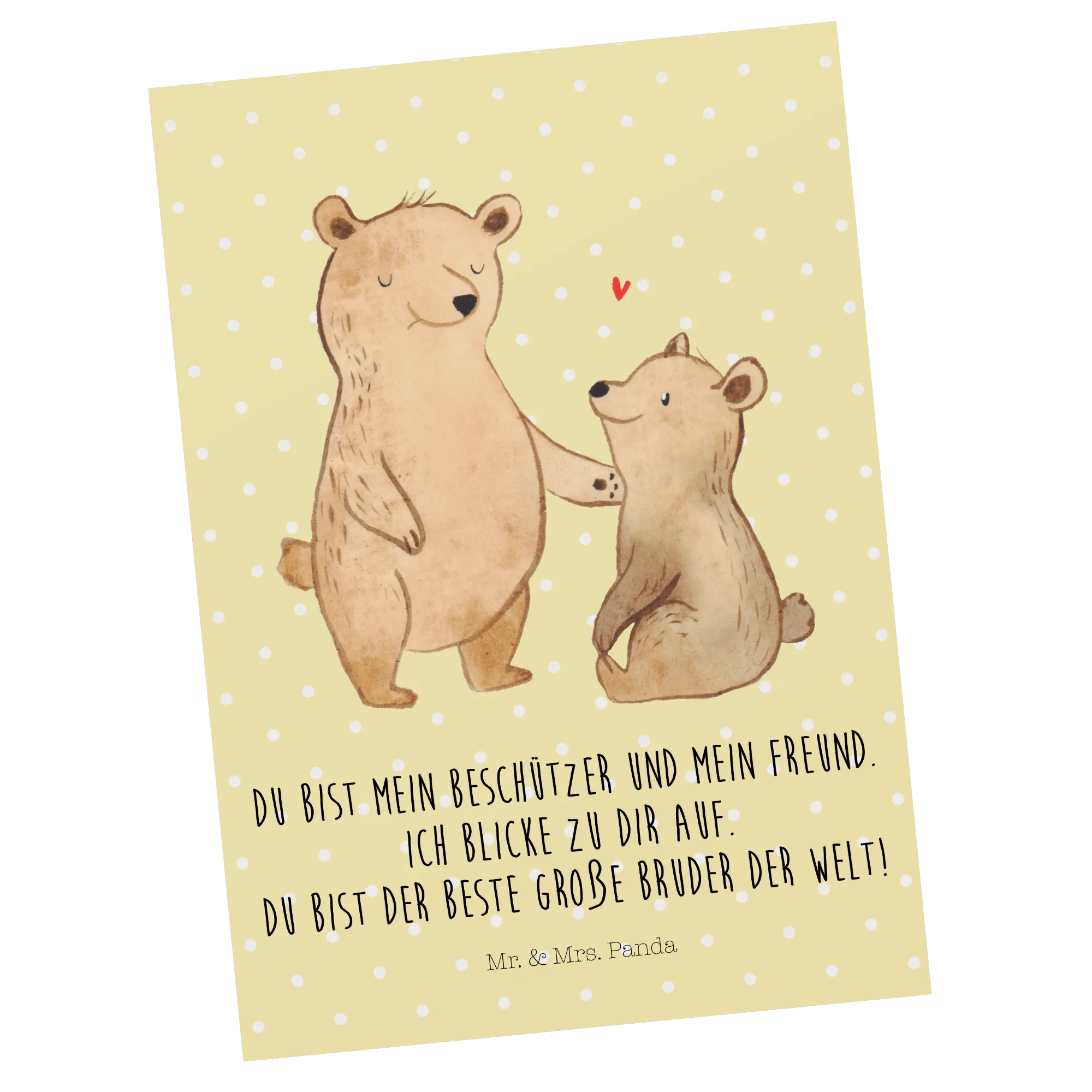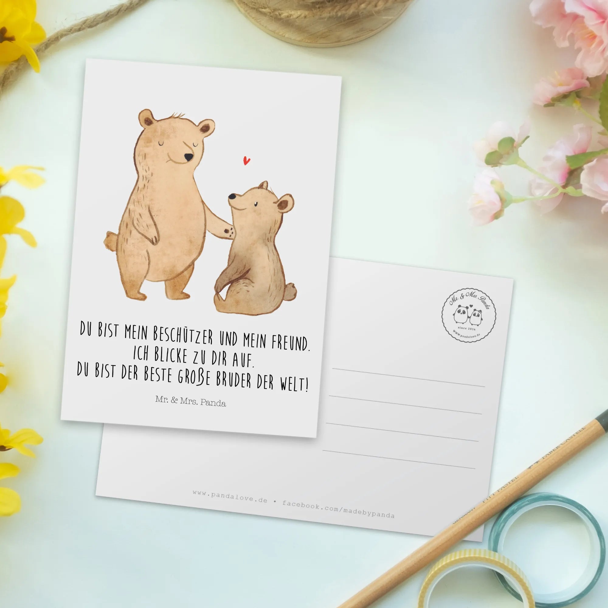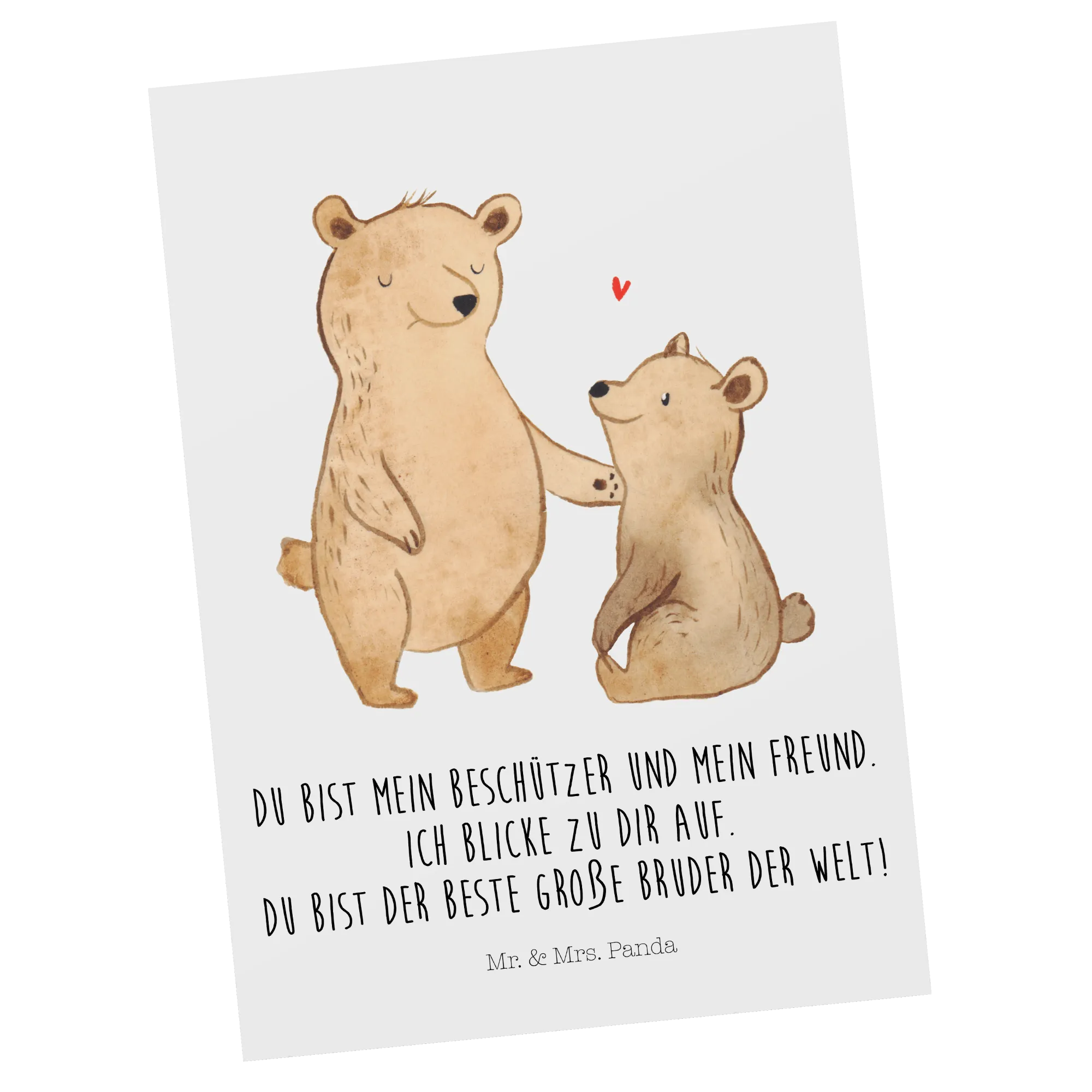 Die Postkarte "Bär Großer Bruder" von Mr. & Mrs. Panda ist das perfekte Geschenk für alle großartigen Brüder und Geschwister. Hergestellt aus hochwertigem 300 Gramm Karton und veredelt mit einer hochglänzenden Vorderseite, strahlt sie nicht nur Eleganz aus, sondern bietet auch eine matte Rückseite, die das Beschriften mit persönlichen Nachrichten erleichtert.