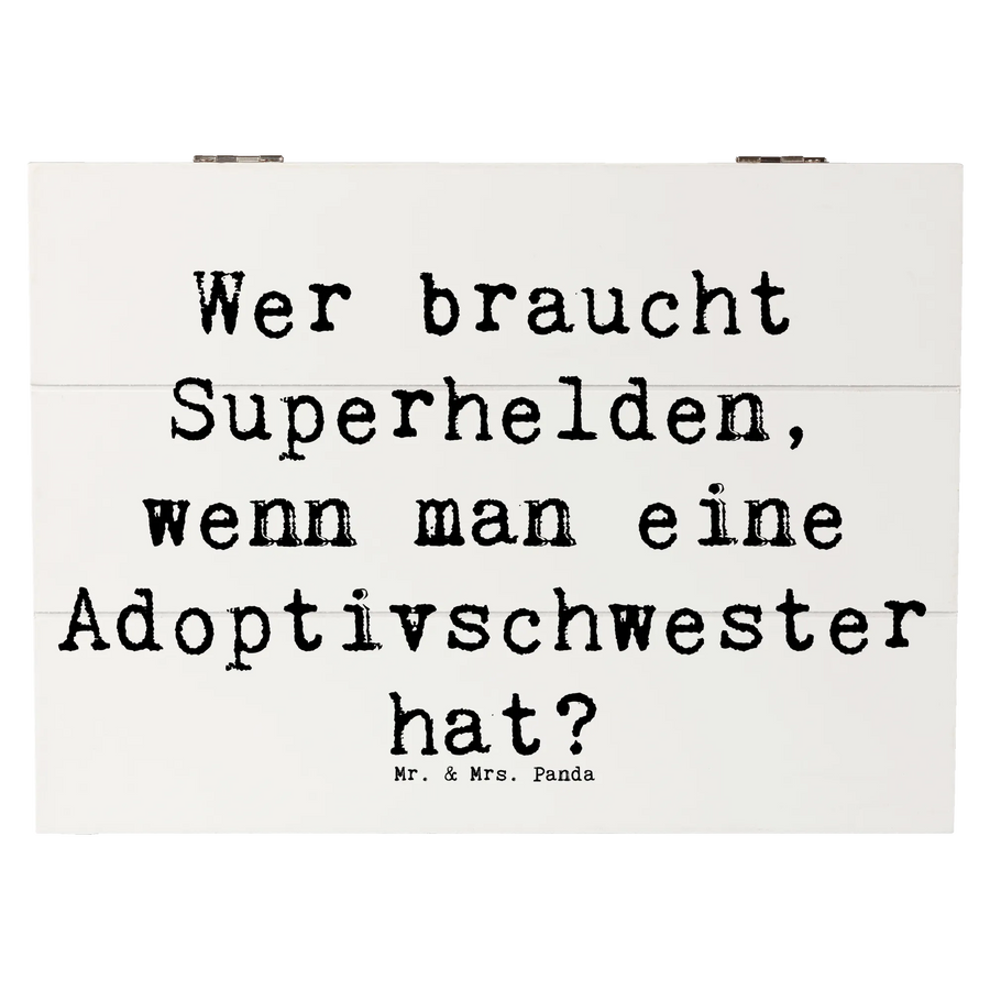 Diese wunderschöne Holzkiste von Mr. & Mrs. Panda ist der perfekte Weg, um die einzigartige Beziehung zu Deiner Adoptivschwester zu feiern. Mit ihrem liebevoll gestaltetem Motiv und dem inspirierenden Spruch "Wer braucht Superhelden, wenn man eine Adoptivschwester hat?" zeigt sie, wie besonders diese Bindung ist.