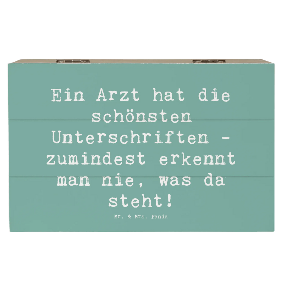 Die wunderschöne Holzkiste von Mr. & Mrs. Panda mit dem Motto 'Ein Arzt hat die schönsten Unterschriften - zumindest erkennt man nie, was da steht!' ist das perfekte Geschenk für alle Mediziner und Gesundheitsbewussten.