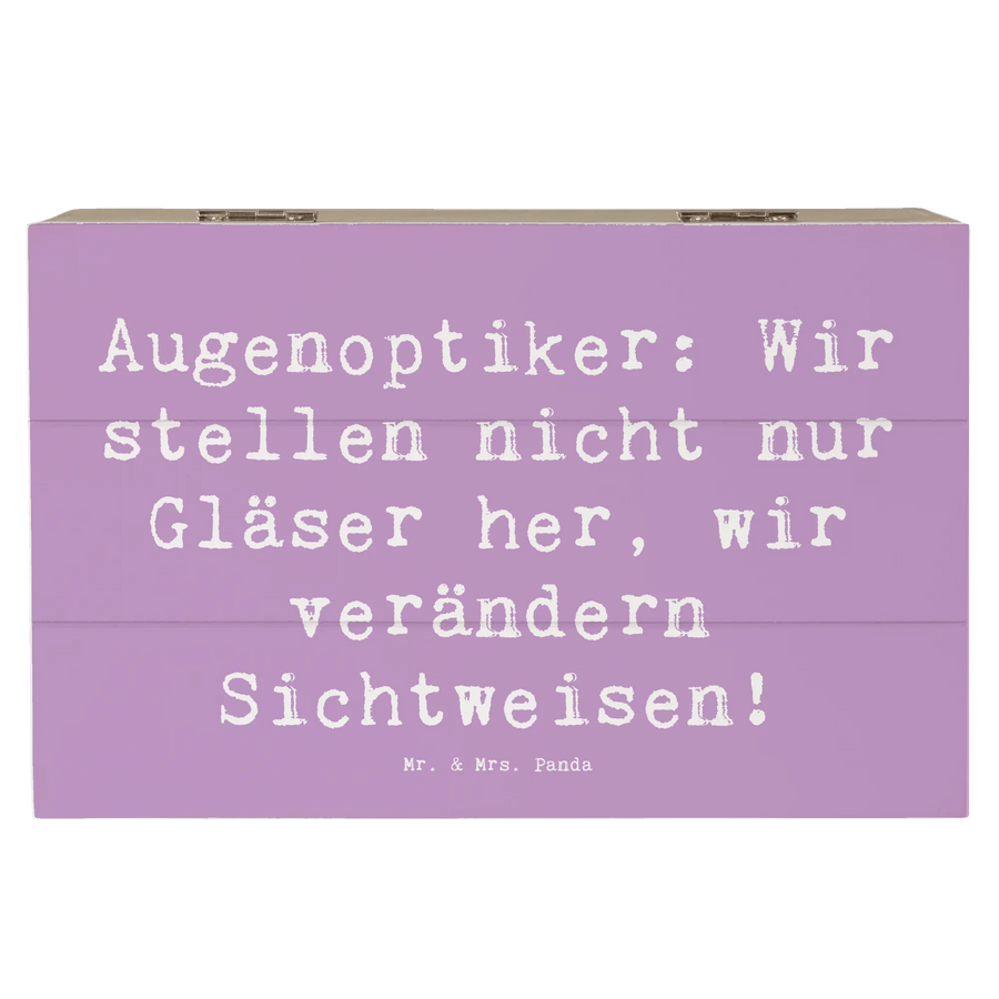 Die wunderschöne Holzkiste von Mr. & Mrs. Panda ist der perfekte Begleiter für alle Augenoptiker und deren wertvollen Erinnerungen! Mit dem spritzigen Slogan "Augenoptiker: Wir stellen nicht nur Gläser her, wir verändern Sichtweisen!" verschönerst Du nicht nur Deinen Arbeitsplatz, sondern schaffst auch einen liebevollen Ort für all die kleinen Schätze, die Dir am Herzen liegen.