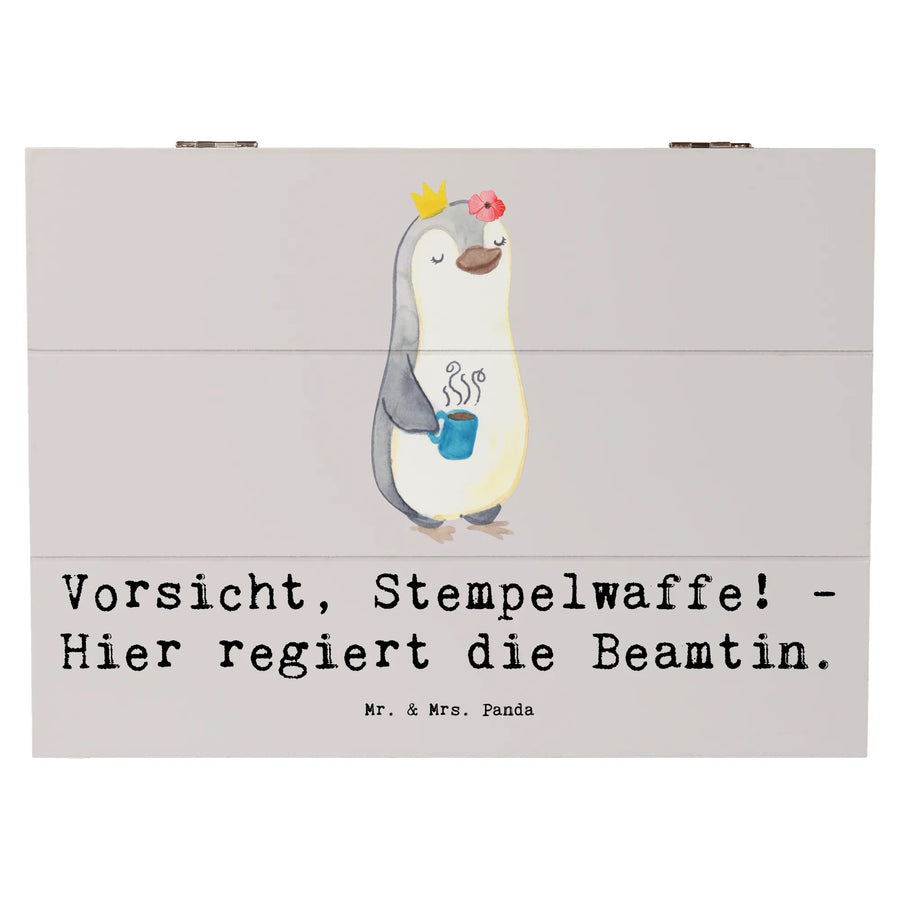 Entdecke die bezaubernde Holzkiste "Beamtin" aus der Kollektion Berufe von Mr. & Mrs. Panda! Diese traumhafte Kiste ist mehr als nur ein Aufbewahrungsort – sie ist ein echtes Schmuckstück für alle, die mit Leidenschaft in ihrem Beruf arbeiten. Mit dem humorvollen Slogan "Vorsicht, Stempelwaffe! - Hier regiert die Beamtin." zaubert sie jedem ein Lächeln ins Gesicht und ist perfekt für die Beamtin in Deinem Leben.