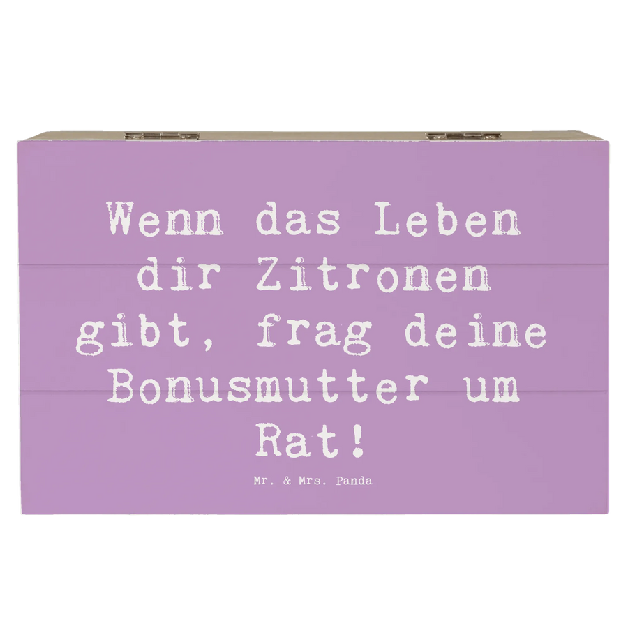 Die wunderschöne Holzkiste von Mr. & Mrs. Panda ist das perfekte Geschenk für deine Bonusmutter! Mit dem liebevollen Spruch "Wenn das Leben dir Zitronen gibt, frag deine Bonusmutter um Rat!" bringt sie ein Lächeln auf ihr Gesicht. Diese praktische Erinnerungskiste ist ideal, um besondere Schätze, Erinnerungen und kostbare Momente festzuhalten. Egal ob zur Feier eines besonderen Anlasses wie Kommunion, Konfirmation oder einfach als Dankeschön – diese Kiste wird ihre Truhe der Erinnerungen.