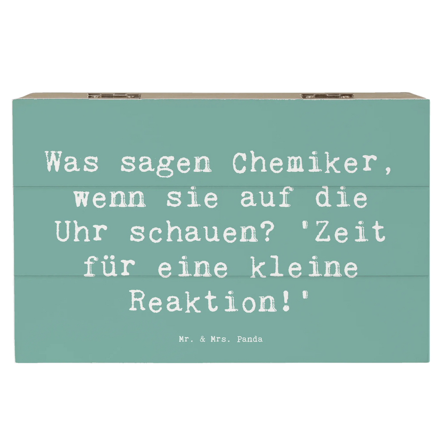 Die wunderschöne Holzkiste von Mr. & Mrs. Panda ist das perfekte Geschenk für Chemiker und all diejenigen, die diesen faszinierenden Beruf lieben. Mit liebevoll handgezeichneten Motiven und dem humorvollen Spruch „Was sagen Chemiker, wenn sie auf die Uhr schauen? 'Zeit für eine kleine Reaktion!'“ wird diese Kiste zum idealen Aufbewahrungsort für persönliche Schätze, Erinnerungsstücke oder wichtige Dokumente.