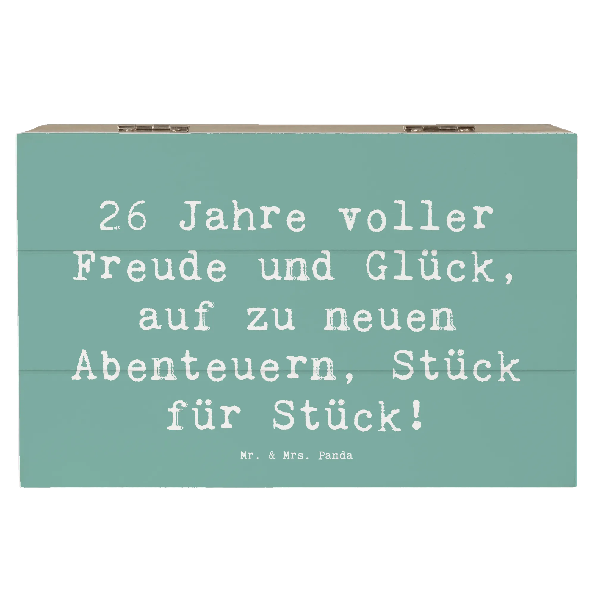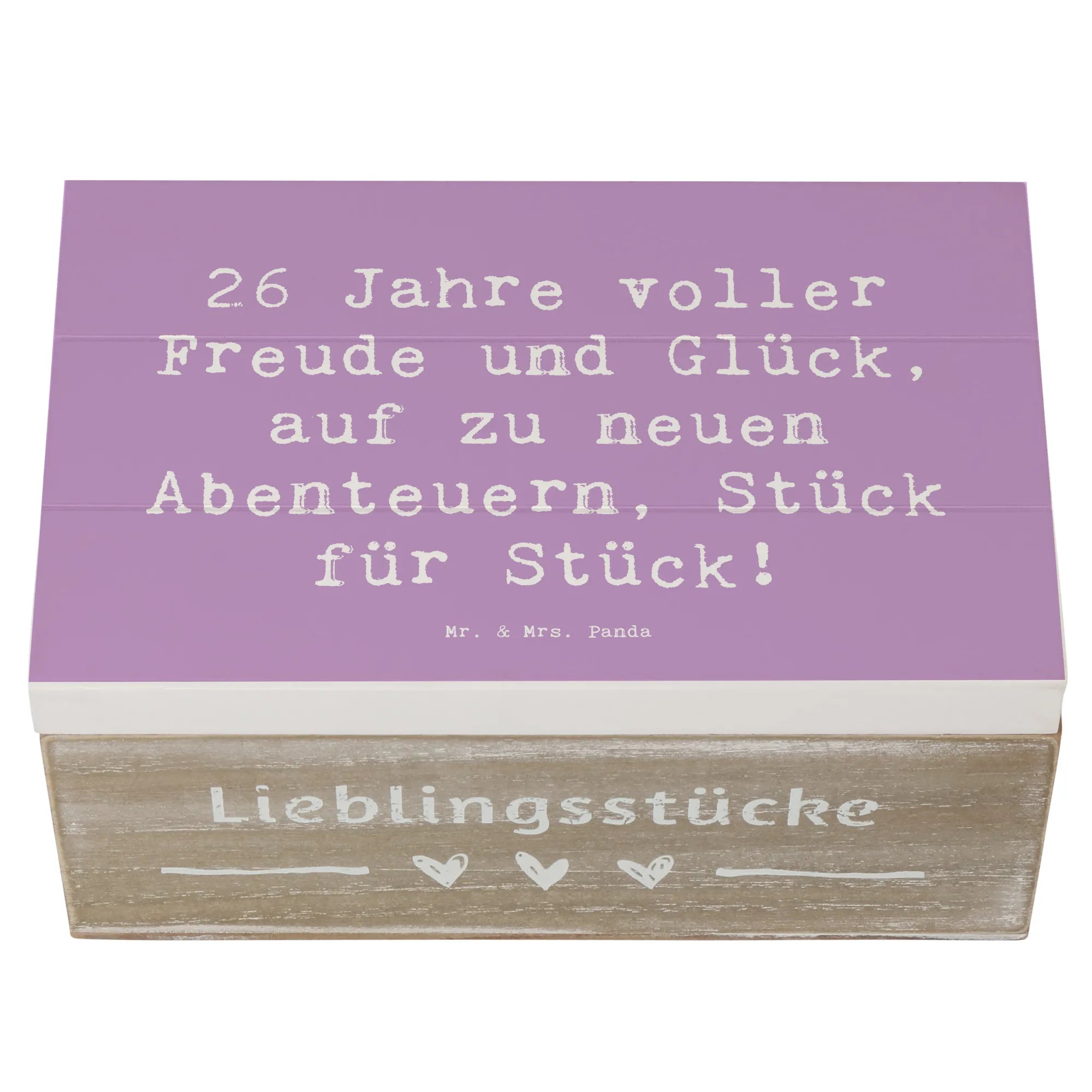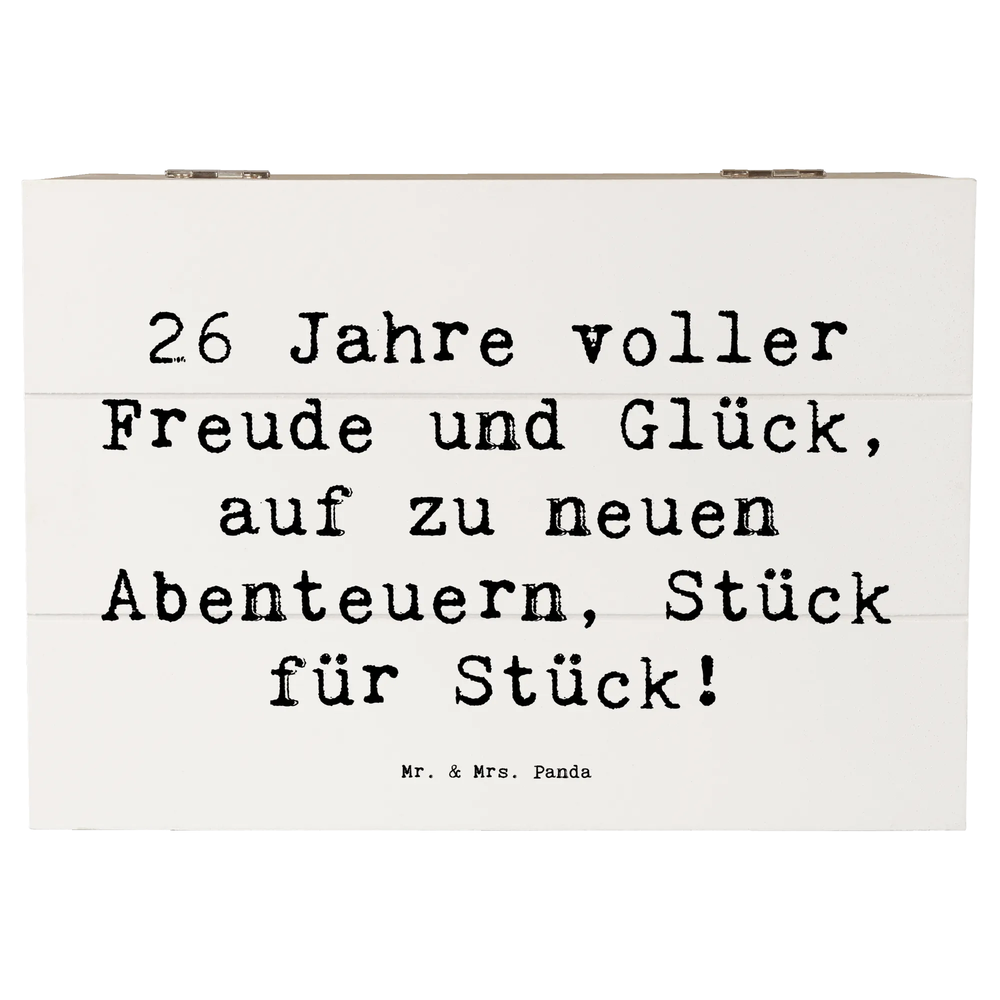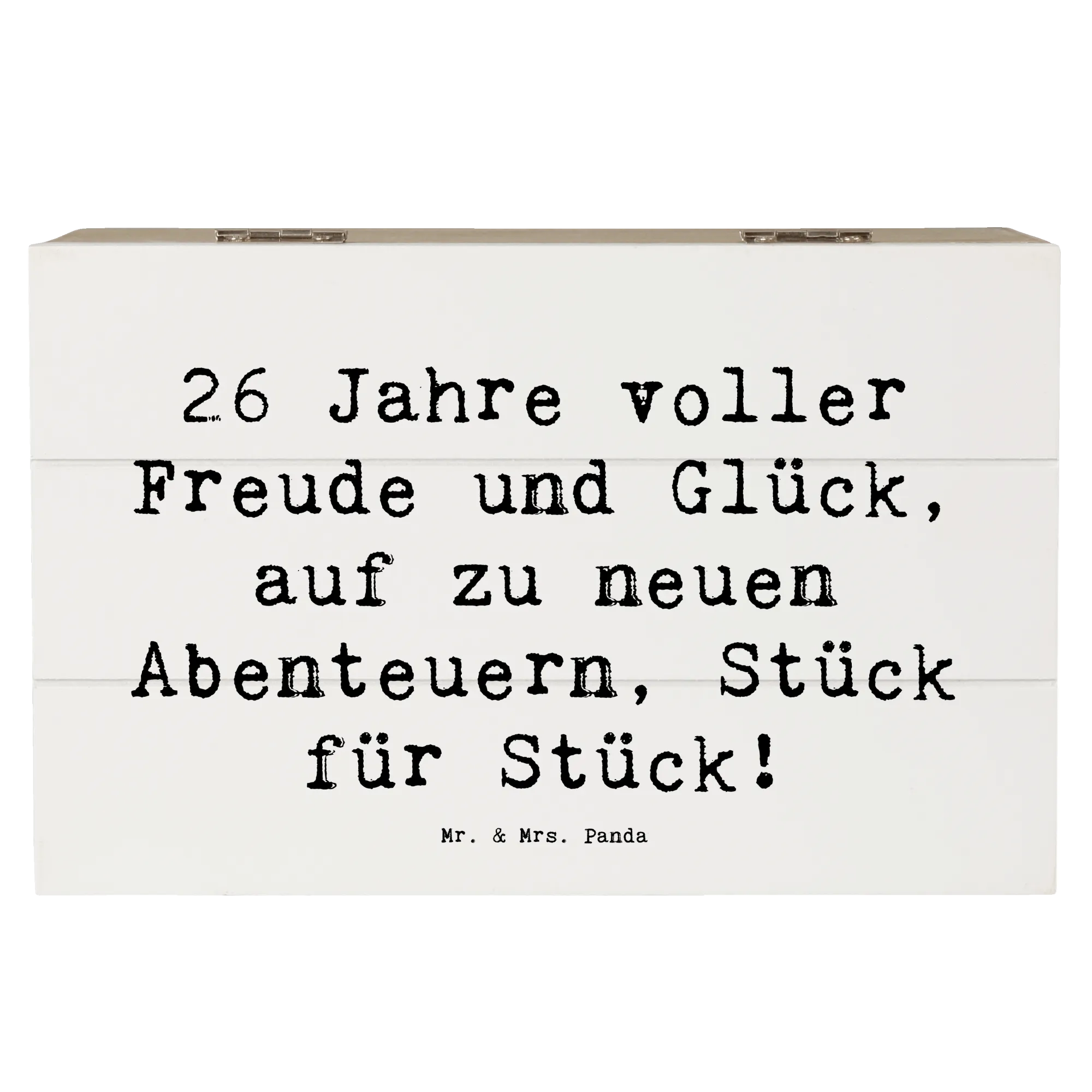 Die Holzkiste von Mr. & Mrs. Panda ist der perfekte Begleiter für den 26. Geburtstag! Mit dem zauberhaften Spruch "26 Jahre voller Freude und Glück, auf zu neuen Abenteuern, Stück für Stück!" wird diese wunderschöne Erinnerungskiste zu einem ganz besonderen Geschenk.