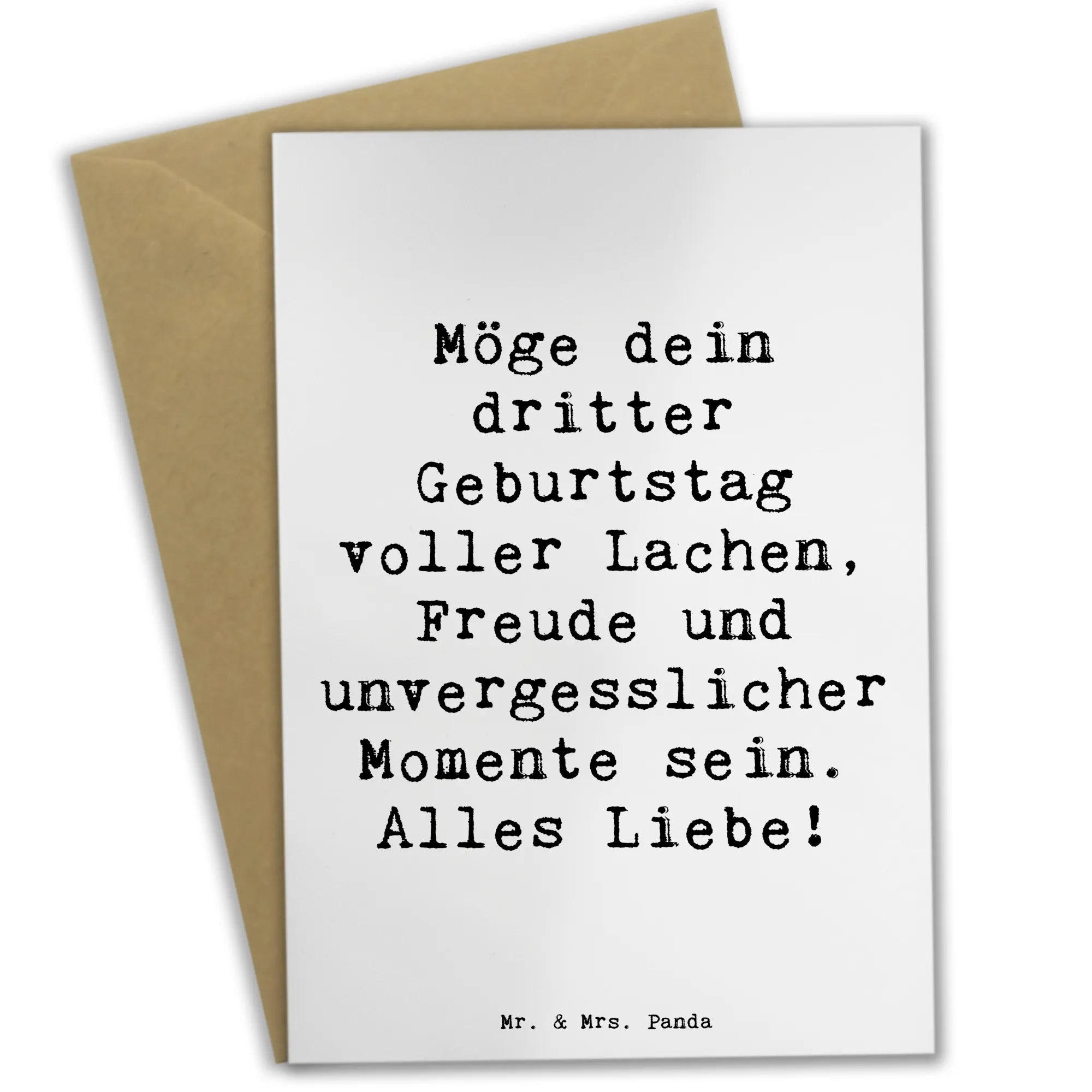 Feierliche Anlässe verdienen besondere Grüße! Mit der zauberhaften Grußkarte zum 3. Geburtstag aus der liebevollen Geburtstagskollektion von Mr. & Mrs. Panda schaffst du unvergessliche Momente. Diese wunderschöne Karte ist nicht nur mit einem herzerwärmenden Spruch bedruckt, sondern hat auch eine edel glänzende Vorderseite, die mit ihrem verspielten Design strahlt. Der Spruch "Möge dein dritter Geburtstag voller Lachen, Freude und unvergesslicher Momente sein. Alles Liebe!" wird nicht nur beim Beschenkten ein Lächeln hervorrufen, sondern bleibt auch als liebenswerte Erinnerung bestehen.
