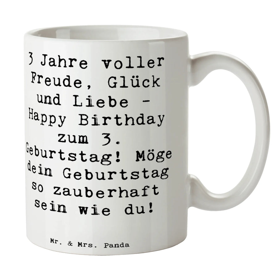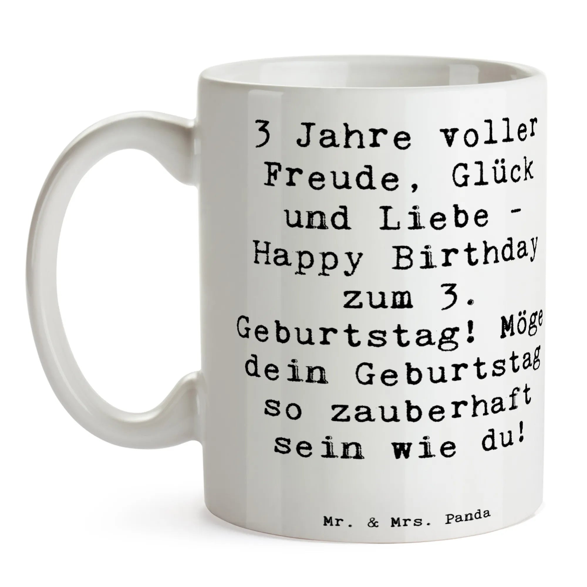 Die perfekte Tasse für den 3. Geburtstag ist da! Diese wunderschöne spülmaschinenfeste Keramiktasse von Mr. & Mrs. Panda ist nicht nur ein praktisches Geschirrstück, sondern auch ein echtes Erinnerungsstück. Der liebevoll gestaltete Slogan '3 Jahre voller Freude, Glück und Liebe - Happy Birthday zum 3. Geburtstag! Möge dein Geburtstag so zauberhaft sein wie du!' zaubert jedem ein Lächeln ins Gesicht und macht jeden Schluck zu etwas Besonderem.