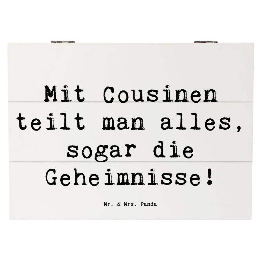 Die wunderschöne Holzkiste von Mr. & Mrs. Panda ist das perfekte Geschenk für deine liebste Cousine! Mit dem liebevollen Spruch 'Mit Cousinen teilt man alles, sogar die Geheimnisse!' auf der Vorderseite, wird sie zu einem ganz besonderen Aufbewahrungsort für wertvolle Erinnerungen. Egal, ob es sich um Fotos, persönliche Gegenstände oder kleine Schätze handelt – diese Kiste bietet genug Platz, um all deine kostbaren Erinnerungen zu speichern.