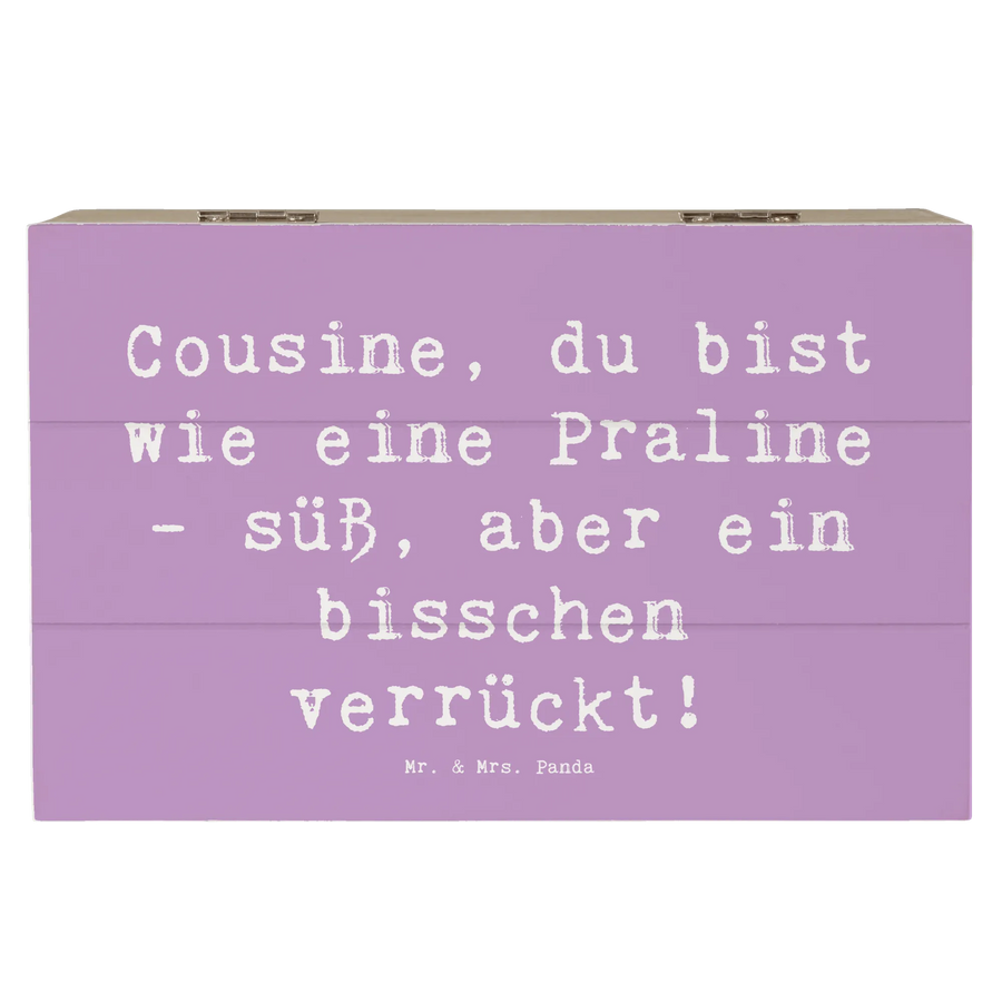 Die wunderschöne Holzkiste von Mr. & Mrs. Panda ist das perfekte Geschenk für Deine liebste Cousine! Mit dem liebevollen Motiv und dem Spruch 'Cousine, du bist wie eine Praline - süß, aber ein bisschen verrückt!' bringt diese Kiste nicht nur einen Hauch von Humor in Eure Beziehung, sondern ist auch ein wunderschöner Aufbewahrungsort für die kostbarsten Erinnerungen.