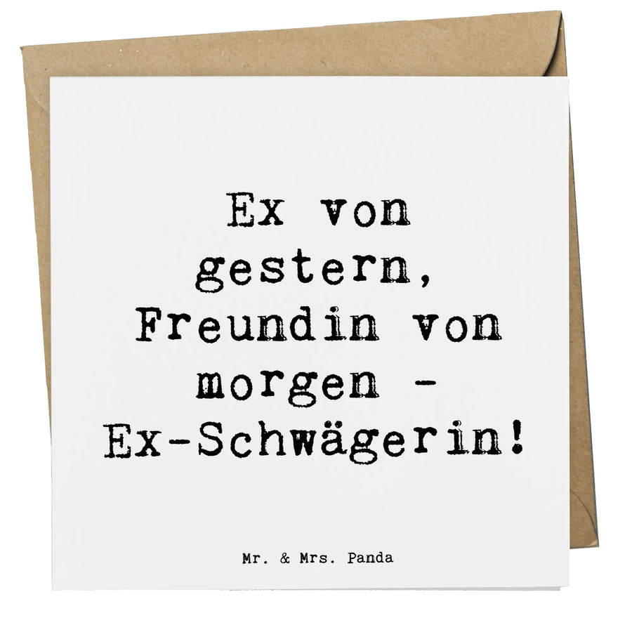 Mit dem kreativen Spruch "Ex von gestern, Freundin von morgen - Ex-Schwägerin!" zauberst du ein Lächeln auf ihr Gesicht und zeigst gleichzeitig, dass sie auch weiterhin einen Platz in eurer Familie hat. Diese hochwertige Klappkarte von Mr. & Mrs. Panda wird aus edlem 300 Gramm Karton hergestellt und besticht durch ihre hochglänzende Vorderseite und matte Innenseite, die sich bestens für persönliche Botschaften eignet.
