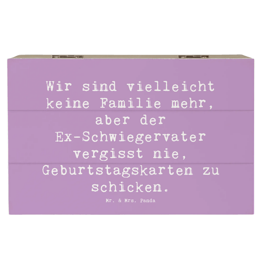 Das hochwertige Material der Kiste verleiht ihr eine edle und nachhaltige Note. Der liebevolle Spruch "Wir sind vielleicht keine Familie mehr, aber der Ex-Schwiegervater vergisst nie, Geburtstagskarten zu schicken." bringt zum Ausdruck, wie wichtig die Verbindung trotz aller Veränderungen ist. Diese Kiste ist nicht nur ein praktisches Aufbewahrungsstück, sondern auch ein wertvolles Erinnerungsstück.