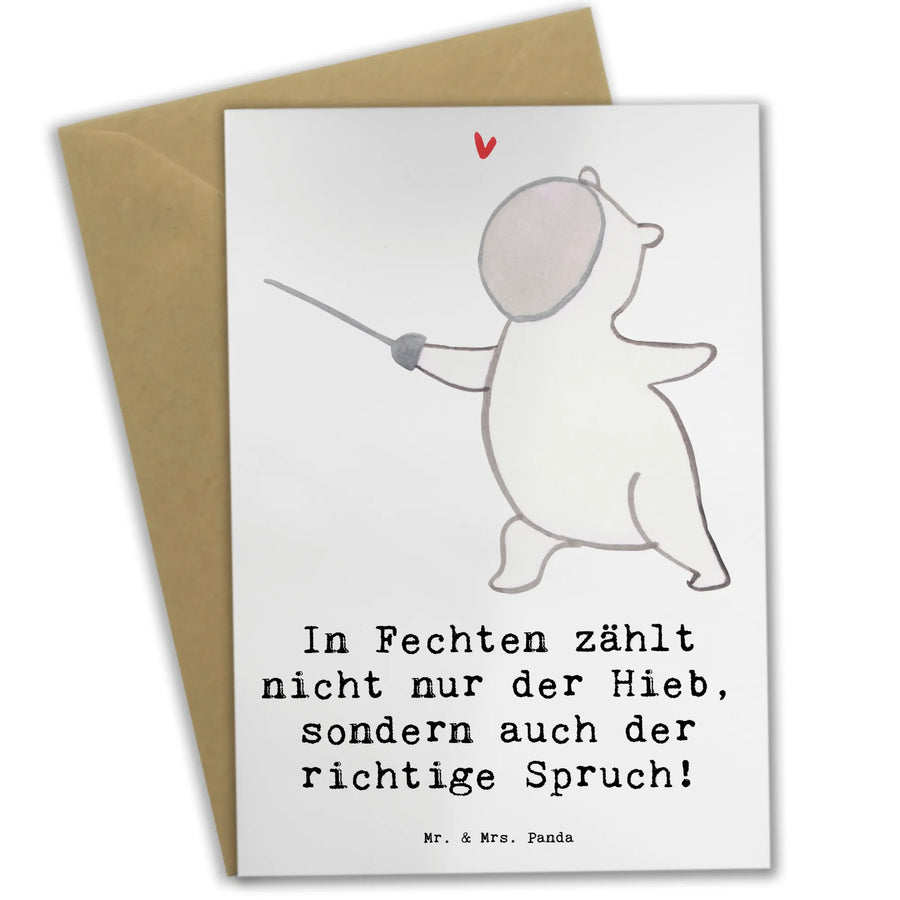 Diese Grußkarte von Mr. & Mrs. Panda begeistert nicht nur durch ihr bezauberndes Fechten-Motiv, sondern auch durch den inspirierenden Spruch: "In Fechten zählt nicht nur der Hieb, sondern auch der richtige Spruch!" Mit einem hochwertigen, matten Innenteil ausgestattet, bietet sie Dir ausreichend Platz, um Deine persönlichen Grüße zu hinterlassen.
