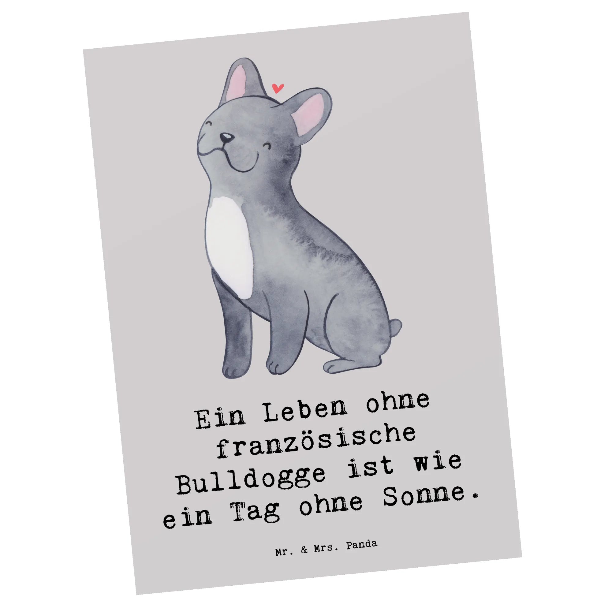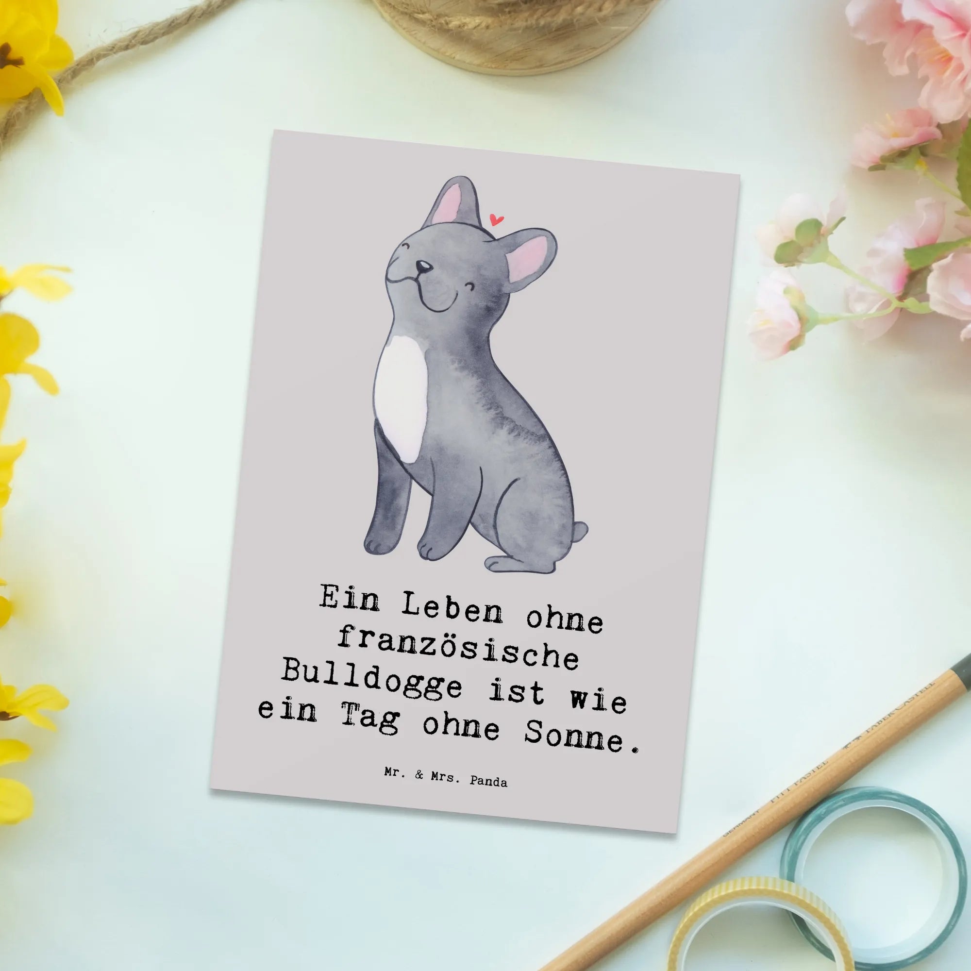 Ein Herzstück aus unserer Hunderassen-Kollektion: Die Postkarte Französische Bulldogge von Mr. & Mrs. Panda zeigt ein liebevoll handgezeichnetes Aquarellmotiv vor einem zarten Grau-Pastell-Hintergrund. Auf der Vorderseite steht der charmante Spruch: „Ein Leben ohne französische Bulldogge ist wie ein Tag ohne Sonne.“ 🐶☀️