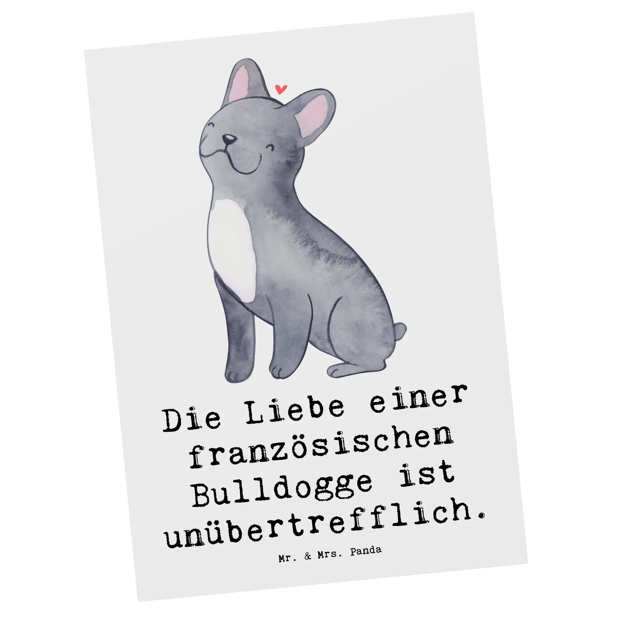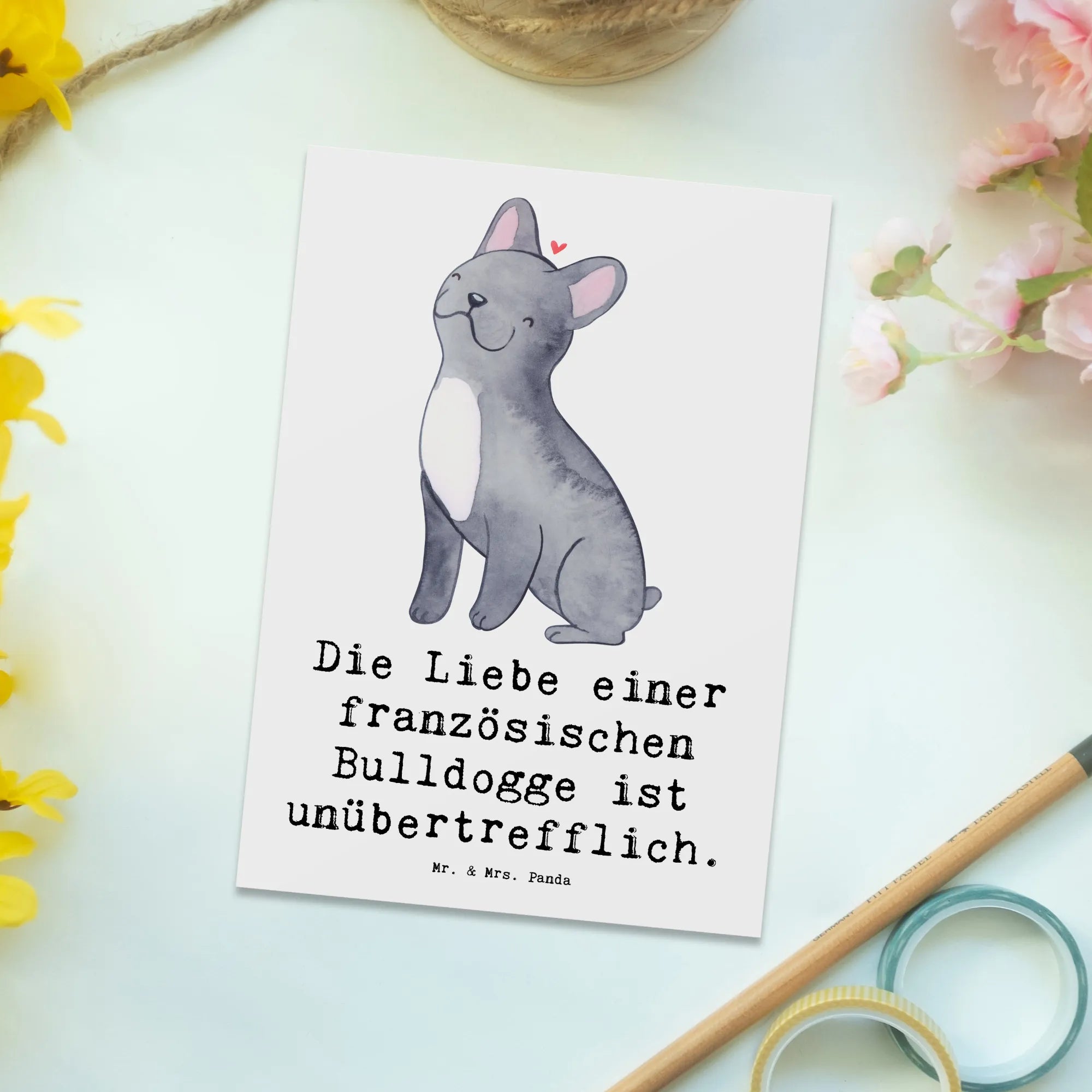 Egal ob Du diese Postkarte für Deinen besten Freund, den Nachbarn oder alle Hundefans im Bekanntenkreis suchst, sie ist perfekt für jeden Anlass. Das süße Motiv der französischen Bulldogge aus der Hunderassen-Kollektion von Mr. & Mrs. Panda ist ideal für jeden Hunde-Fan oder als liebevolles Geschenk für einen besonderen Menschen.